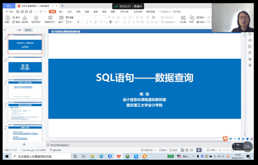 10月11日下午,k1体育智能会计教学工作坊(第十八期)在钉钉APP上采取了线上直播的方式举行。本次活动由教育部会计信息化课程虚拟教研室、重庆市成渝数智会计虚拟教研室、重庆市会计信息化教学名师工作室和重庆市交叉学科教指委联合主办。本次教学工作坊以“SQL语句-数据查询”为主题,继续邀请重庆理工大学陈旭教授为同学们讲授会计数据分析与处理的系统操作。学院2022级会计专硕全体员工参加了此次教学工作坊。