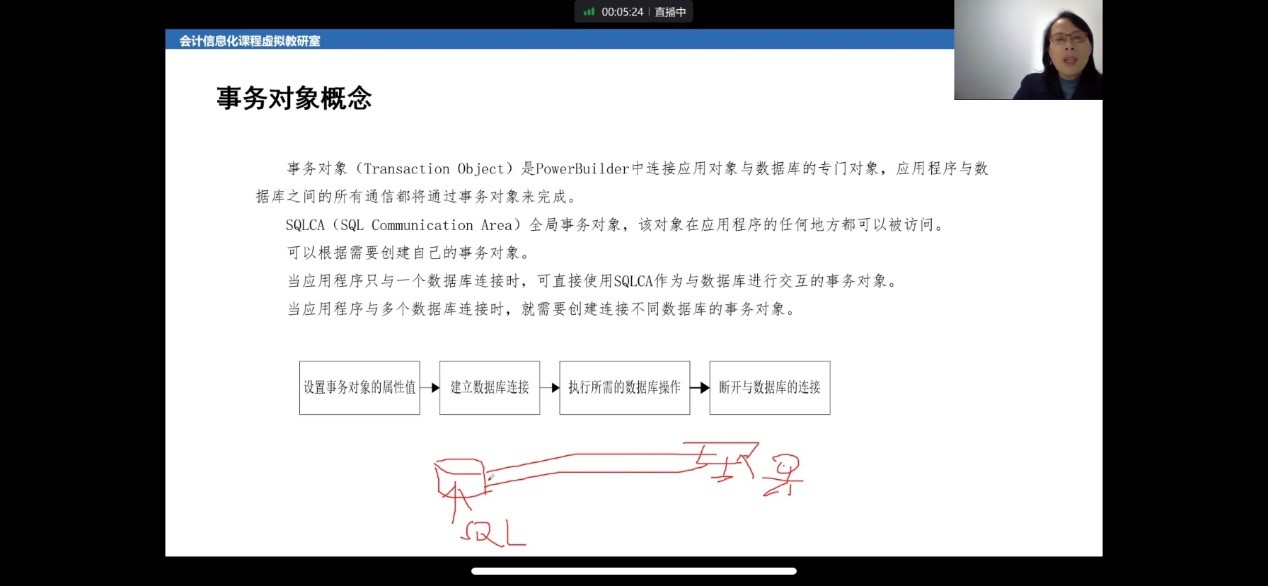 第二十六期的教学工作坊以“应用数据窗口实现对数据的查询”为主要授课内容,陈旭教授向我们讲解了事务对象SQLCA、数据窗口控件常见函数、数据窗口常用事件等工具,旨在实现数据查询和商品信息管理。陈旭教授依托案例,演示了如何创建事物对象、怎样连接数据库测试连接情况,运用setTransObject函数为data window设施事物对象以及运用retrieve函数查询数据。之后,陈旭教授又向我们演示了如何运用InsertRow 、DeleteRow、Update、Reset、RowCount函数实现对数据简单的增删改查询操作,并演示了如何结合RowCount函数实现动态数据条目计数。