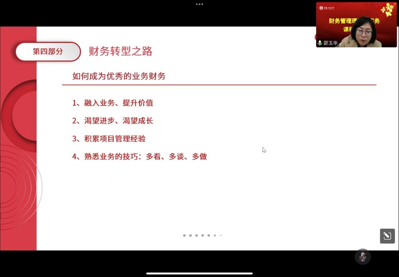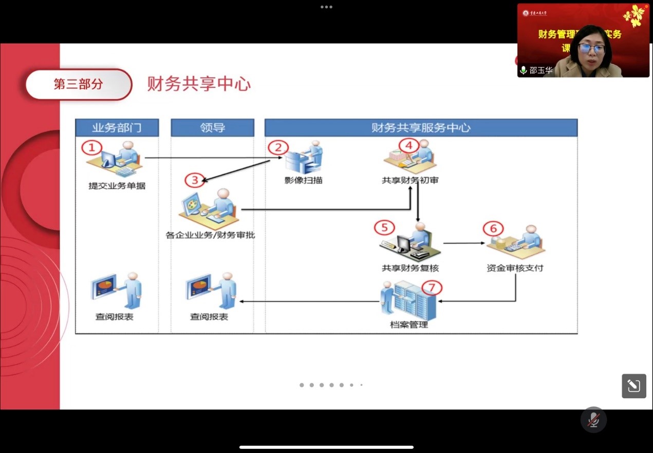 2022年12月8日晚上,k1体育MPAcc教育中心通过腾讯会议成功举办了以“财务共享下的财务转型之路”为主题的《财务管理理论与实务》课程报告;主讲人为欧菲斯集团股份有限公司财务经理、高级会计师、中国注册会计师、税务师邵玉华女士,邵经理拥有多年的财务高管经历,在IPO财务规范性、财务信息化建设、集团财务团队管理方面颇有建树。2022级MPAcc全体员工、k1体育的唐俐教授、程文莉教授参加了此次讲座。