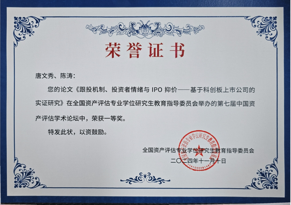 第七届中国资产评估学术论坛暨《资产评估研究》2024年研讨会近日在首都经济贸易大学成功举办,公司2023级硕士研究生陈涛撰写的论文入围本届论坛,并荣获优秀论文一等奖。