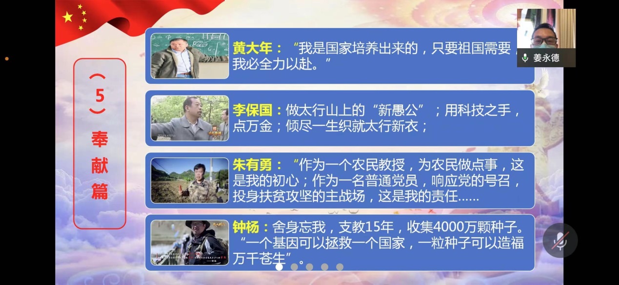 在接下来的“好…好…学习”专栏,姜永德同志给大家推荐了师德典型引领——时代楷模纪录片。这部纪录片有13集,分别讲述了黄大年、李保国、刘永坦、张桂梅等人的感人事迹。姜永德总结了这些时代楷模在“师德”方面的共同特点,那就是“忠党、爱国、敬业、无私、奉献”。最后,他认为我们作为当代高公司党员教师,应该做到以下内容:加强学习,不断提高党性修养;爱国敬业,不要只汲汲于富贵;孜孜不倦,努力提升教师魅力;无私奉献,力求关爱所有员工。