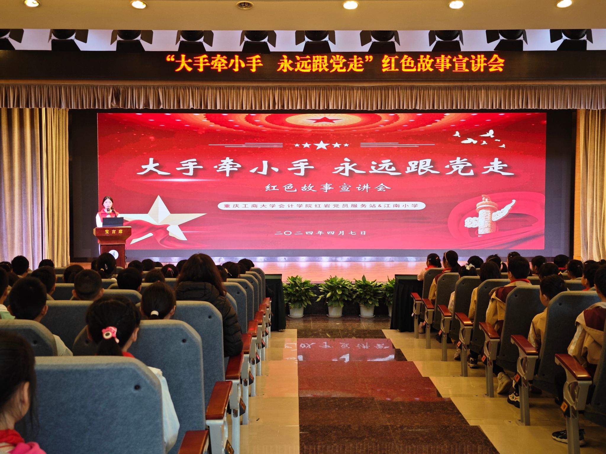 一双双满含希冀的眼睛、一次次踊跃积极的互动、一声声坚定响亮的回答……2024年4月7日,由k1体育红岩党员服务站主办的“大手牵小手,永远跟党走”红色故事宣讲会在江南小学开展。活动通过宣讲一个个引人入胜的红色故事,不时穿插趣味十足的互动小游戏,为江南小学的小员工们带去了一堂别开生面的思政课,这也是推进大中小员工思想政治教育一体化建设的生动实践。