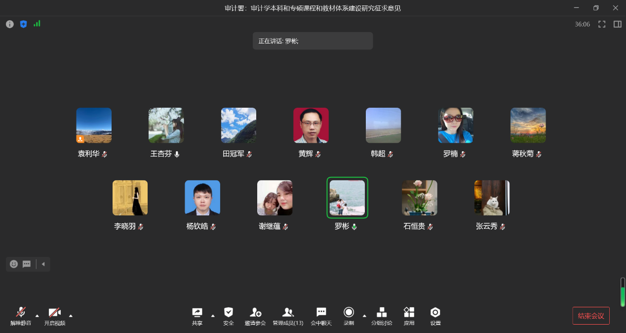 最后,王杏芬主任对各位教师的建议进行了总结,并结合审计署审计科研所的这两个研究报告征求意见稿,强调了审计系近期的学科与人才培养重点工作。黄辉副经理希望审计系在会后梳理总结各位老师的建议,及时回函审计署审计科研所,同时继续学习这两个研究报告,取长补短,形成自己的特色。