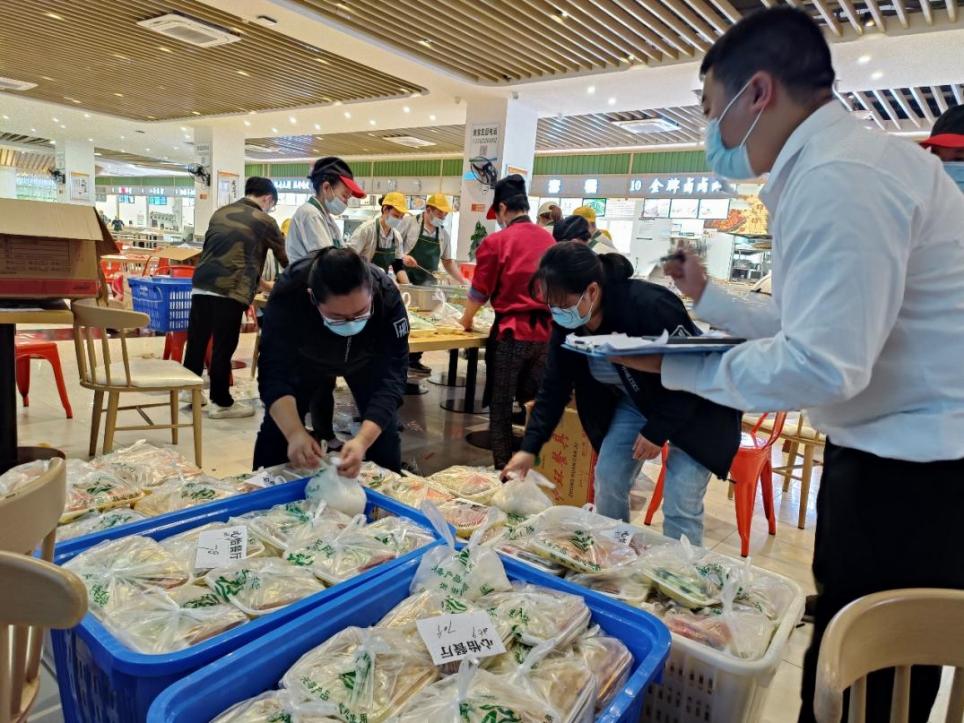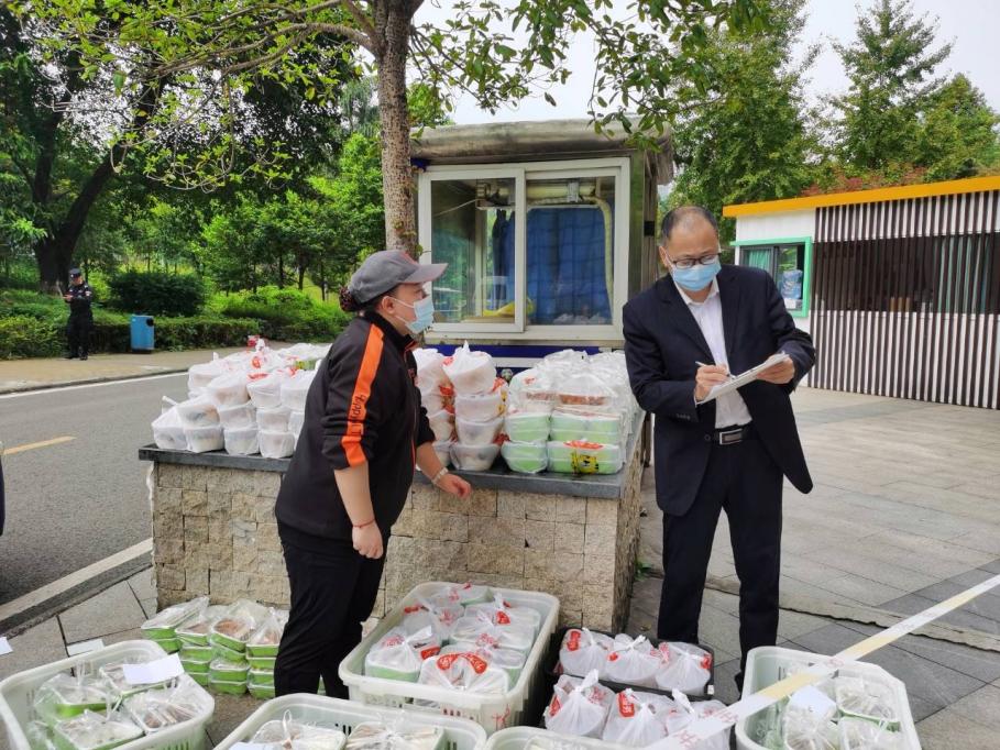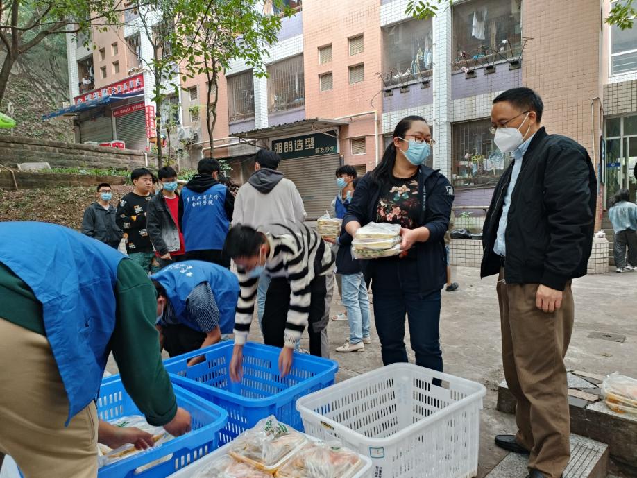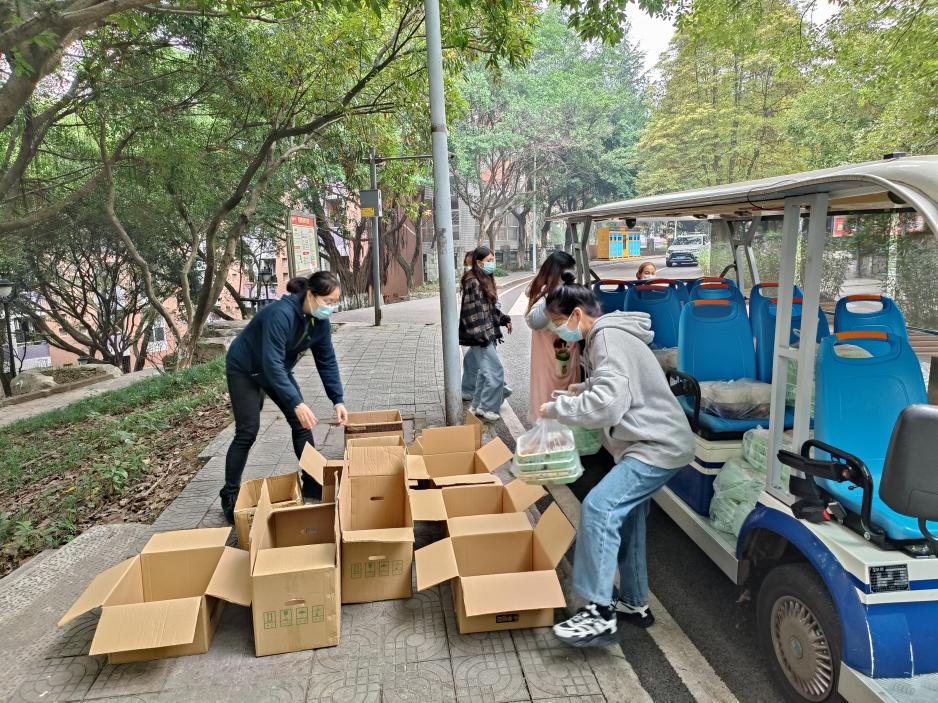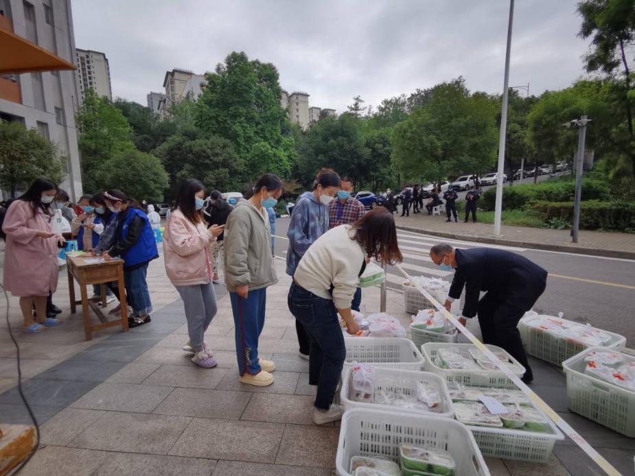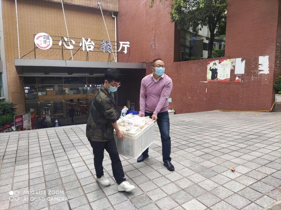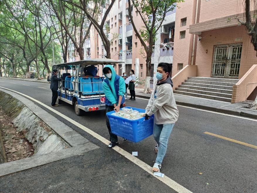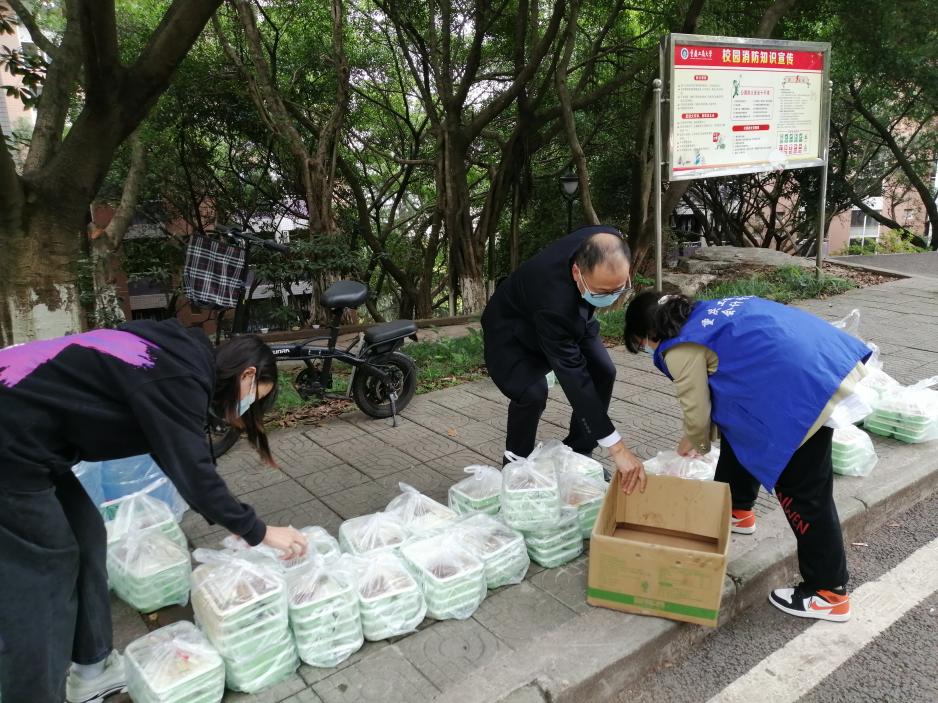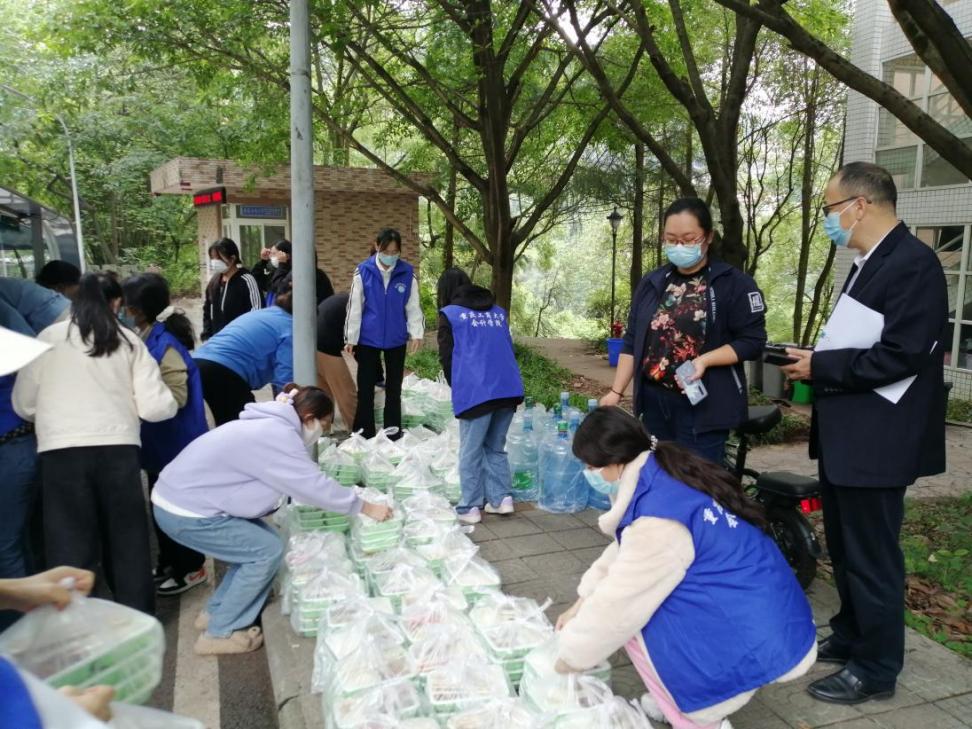 为了保障临时管控期间每个员工能按时用餐,学院全体工作人员总是每天清晨赶到各楼栋,组织楼栋干部和员工志愿者为每位同学分发配餐。每天上午10:00、下午4:00,在学校食堂供餐人手不够的情况下,主动到相应食堂协助食堂工作人员分装餐盒、清点份数、装车配送至员工主体楼栋,为的是让每位同学都能尽快吃上热腾腾的饭菜。然而,大家总是等到最后一名员工接过饭菜后,自己才回到办公室用餐。