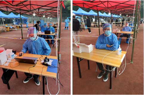 为能够向学校抗疫出一份力,学院众多教职工也纷纷表示愿意进校参与志愿服务。根据学校疫情防控实际情况,由学校统一调度,学院崔杰杰老师有幸进校参与了核酸检测服务工作,他还利用服务间歇积极为员工派发早餐。