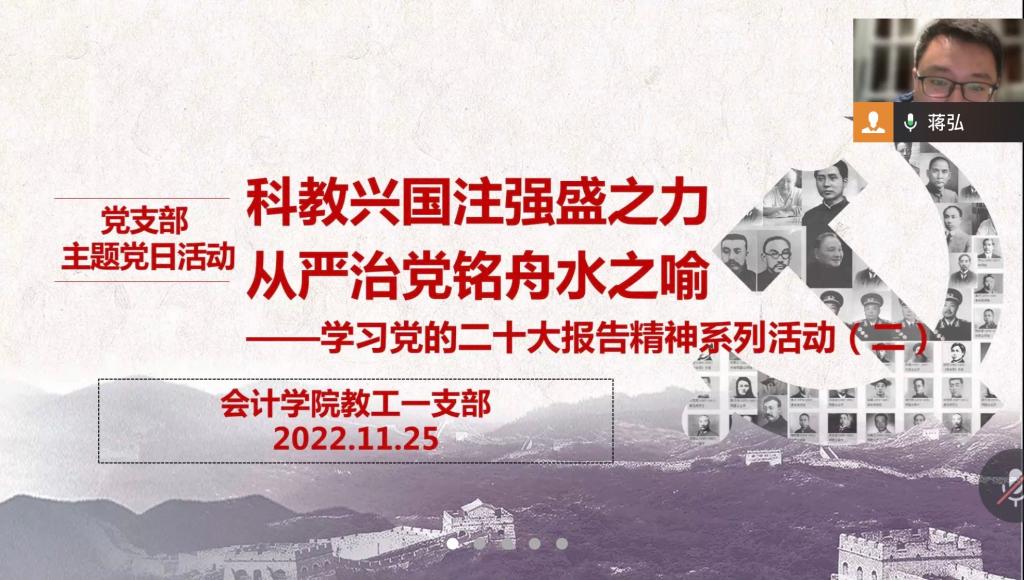 2022年11月25日,k1体育教工一支部开展的学习党的二十大报告精神系列活动进入第二期,本次活动以“科教兴国注强盛之力,从严治党铭舟水之喻”为主题。科教兴国为中华民族的强盛注入永世不竭的动力,从严治党让中共党员铭记水能载舟亦能覆舟的比喻,该主题紧扣了本次活动的学习内容。