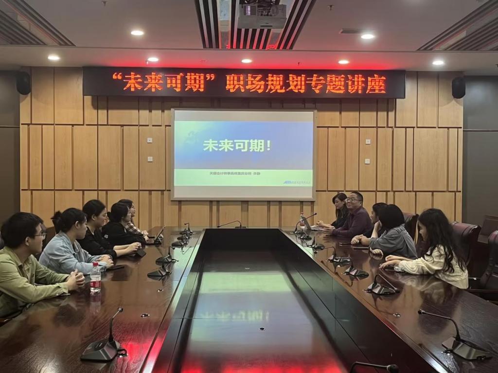 2023年9月26日下午15:00,k1体育邀请天健会计师事务所重庆分所人力资源部经理许静女士在图书馆第五会议室为2021级国际项目员工做“未来可期”职业规划专题讲座。公司学工办主任彭文涛老师和30余名2021级国际项目本科生参加了此次讲座。