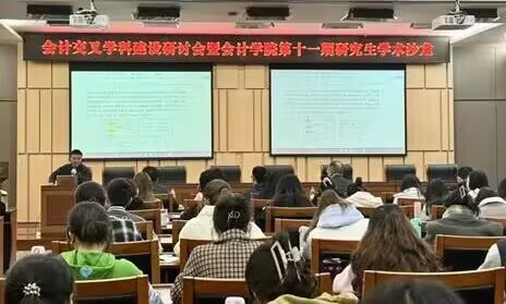 随后周愉峰分享重要项目申报经验,讲解国家自科、国家社科、教育部项目申报相关差异,指出要多申报多积累,反复打磨申报书,讲解融合多种学科的项目申报成功案例,有多位老师提问交流,周教授进行了很好的回应。马富祺同学从个人体会、文献整理、数据分析等方面分享学术论文写作经验。然后谢欣雨、吴俊希两位研究生分别围绕宽松货币政策与企业全要素生产率,数字化转型与社会责任主题从研究背景、文献回顾、理论分析与研究假设、实证分析、结论建议等方面汇报了论文。老师们针对研究生汇报的论文进行了深入细致的点评。