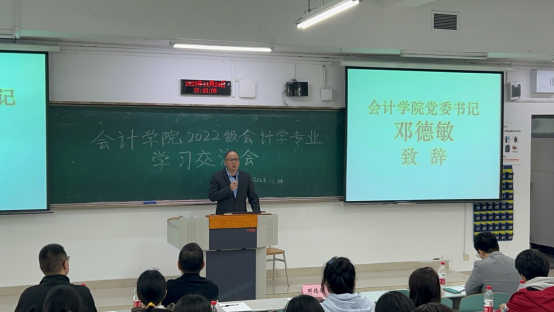 接下来,邓德敏书记在他的致辞中鼓励同学们要勇于创新、敢于尝试,不断提升自己的综合素质。他指出,本次交流会可以帮助同学们更好地适应从通识学院转入专业学院学习这一变化。邓书记说,会计作为一门应用性很强的学科,需要不断地进行学习和实践,才能更好地适应行业发展的需要。他还强调,作为一名优秀的会计人,除了掌握专业技能外,还需要具备良好的沟通能力和团队协作精神。