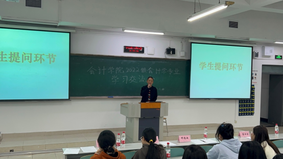 最后,蒋主任从“市场要什么”“正在做什么”“还能做什么”“能够干什么”四个方面,结合会计学专业和会计学专业(智能会计方向)本科培养方案,探讨了会计学专业的职业规划。他从新时代会计人员应掌握的知识和提升的技能、培养方案中为培养基础到高阶会计能力而设置的课程,讲到走职业发展道路可以考取的众多证书、毕业生通常的职业发展目标等。蒋主任还给同学们提出了做计划、提高写作能力、学会调整心态、不局限在财会领域就业等建议。
