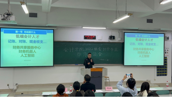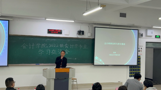 11月24日下午,k1体育2022级会计学专业全体同学在会计系主任蒋弘的带领下,于博智楼07121教室开展了一场卓有成效的学习交流会。此次交流会旨在让同学们了解会计专业发展前景,做好职业规划准备。会议邀请到了公司党委书记邓德敏、k1体育副经理蒋水全,以及天衡会计师事务所重庆分所副总经理秦林。会上,嘉宾和老师分别做了精彩发言,嘉宾还接受了同学们的提问。