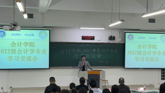 首先,蒋水全副经理作为会议主持人,从宏观角度,对会计学专业的未来发展提出了几点看法。蒋经理提醒同学们在学习的过程中要了解哪些课程是大家需要重点掌握的,还以自身为例子,给同学们分享了学习经验。