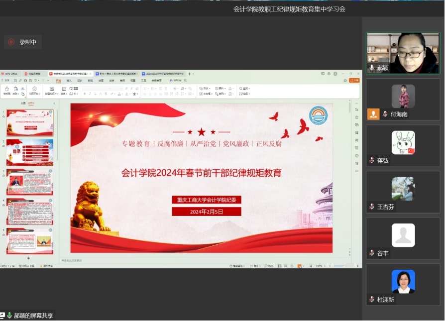 会上,郝颖书记带领大家学习了《二十届中央纪委三次全会精神》、《六届市纪委三次全会精神》和修订后的《中国共产党纪律处分条例》,重温了《中央八项规定及其实施细则》,探讨了《中央纪委国家监委及市纪委监委近期通报的违反中央八项规定精神典型问题案例》等内容,强调全院教师要从案件中汲取教训,引以为鉴,自觉遵守中央八项规定精神和廉洁自律各项规定,坚决不违规违法。