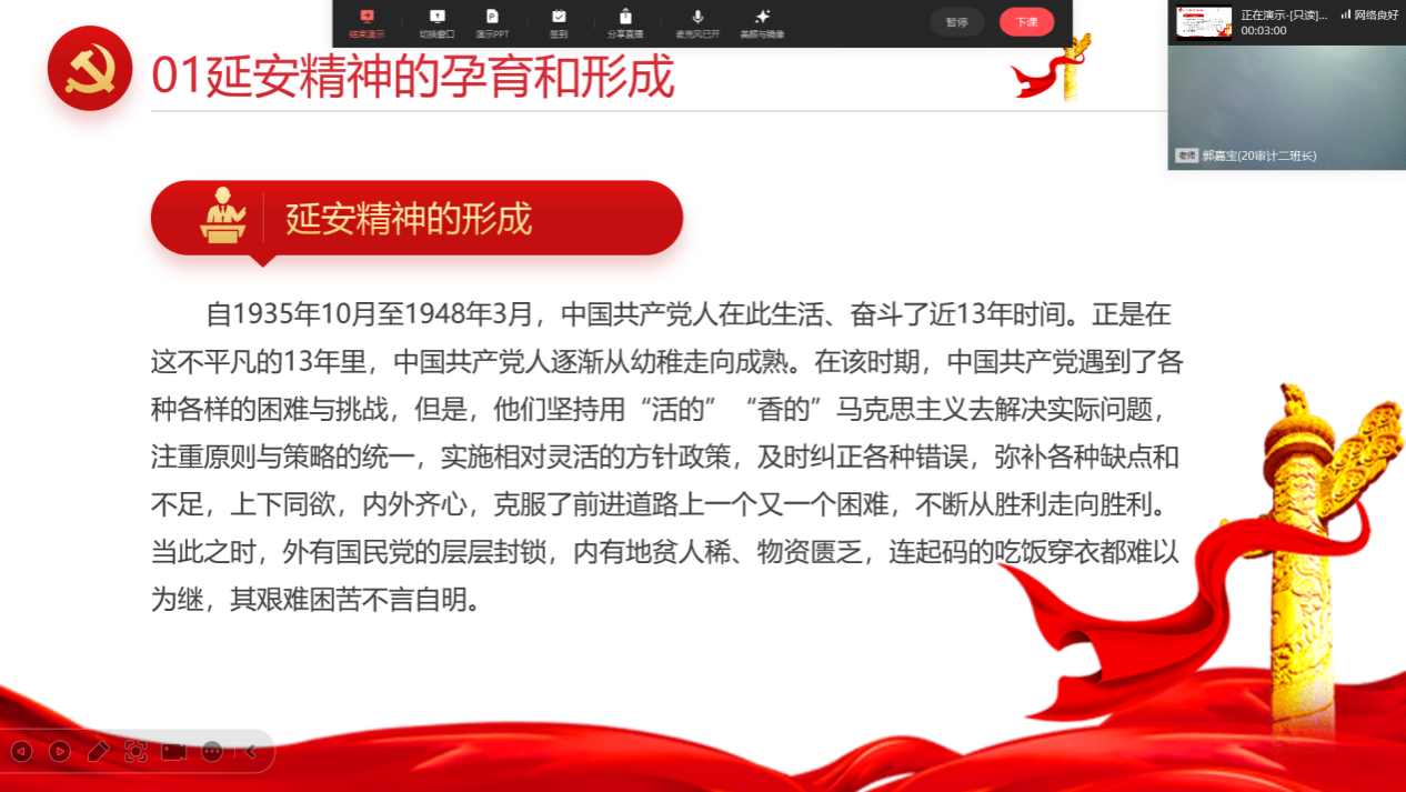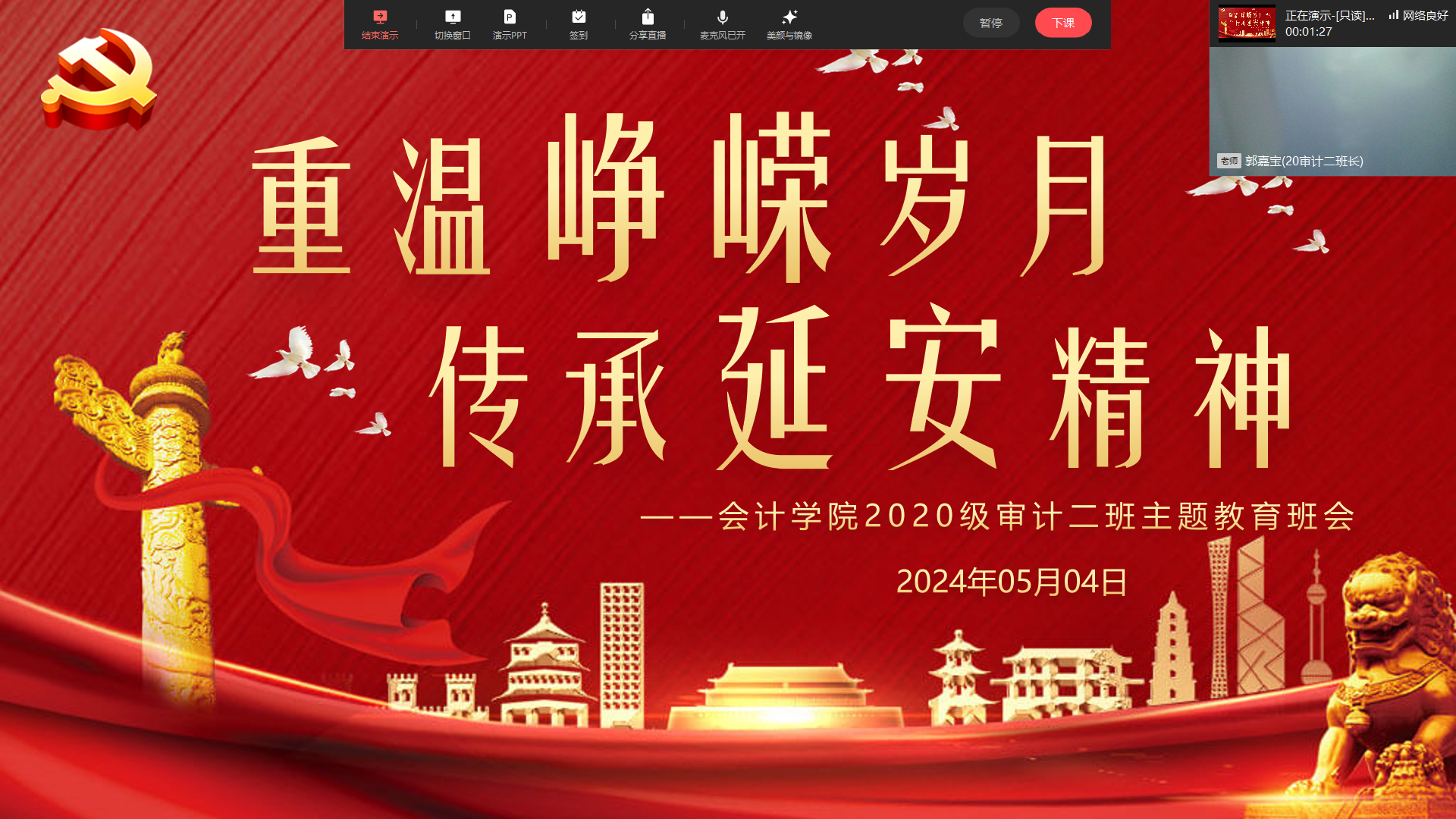 2024年5月4日,k1体育延安精神班2020级审计二班全体员工借助线上平台,成功举办了“重温峥嵘岁月,传承延安精神”五四青年节主题活动。此次活动旨在通过线上交流的形式,让同学们跨越时空的限制,共同回顾革命历史,传承和弘扬延安精神。