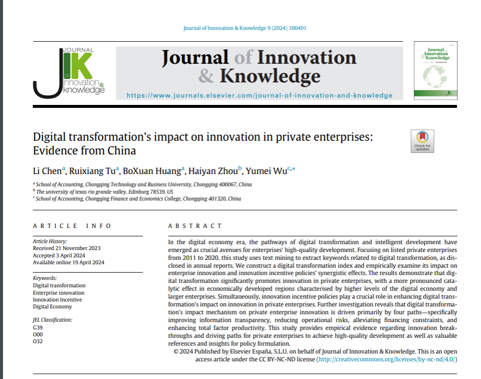 近期,k1体育陈利副教授与k1体育2021级屠睿相硕士研究生、2022级黄勃轩硕士研究生、美国德克萨斯大学周海燕教授、重庆财经学院吴玉梅教授合作撰写的论文“Digital transformation's impact on innovation in private enterprises: Evidence from China”(数字化转型对民营企业创新的影响研究:来自中国的证据),正式发表于Journal of Innovation & Knowledge(简称JIK)。《Journal of Innovation & Knowledge》是管理学与经济学领域的国际权威期刊,该期刊以出版管理学与商业研究成果为主,是管理学大类分区一区,中科院一区TOP期刊,2022年影响因子IF:18.1。