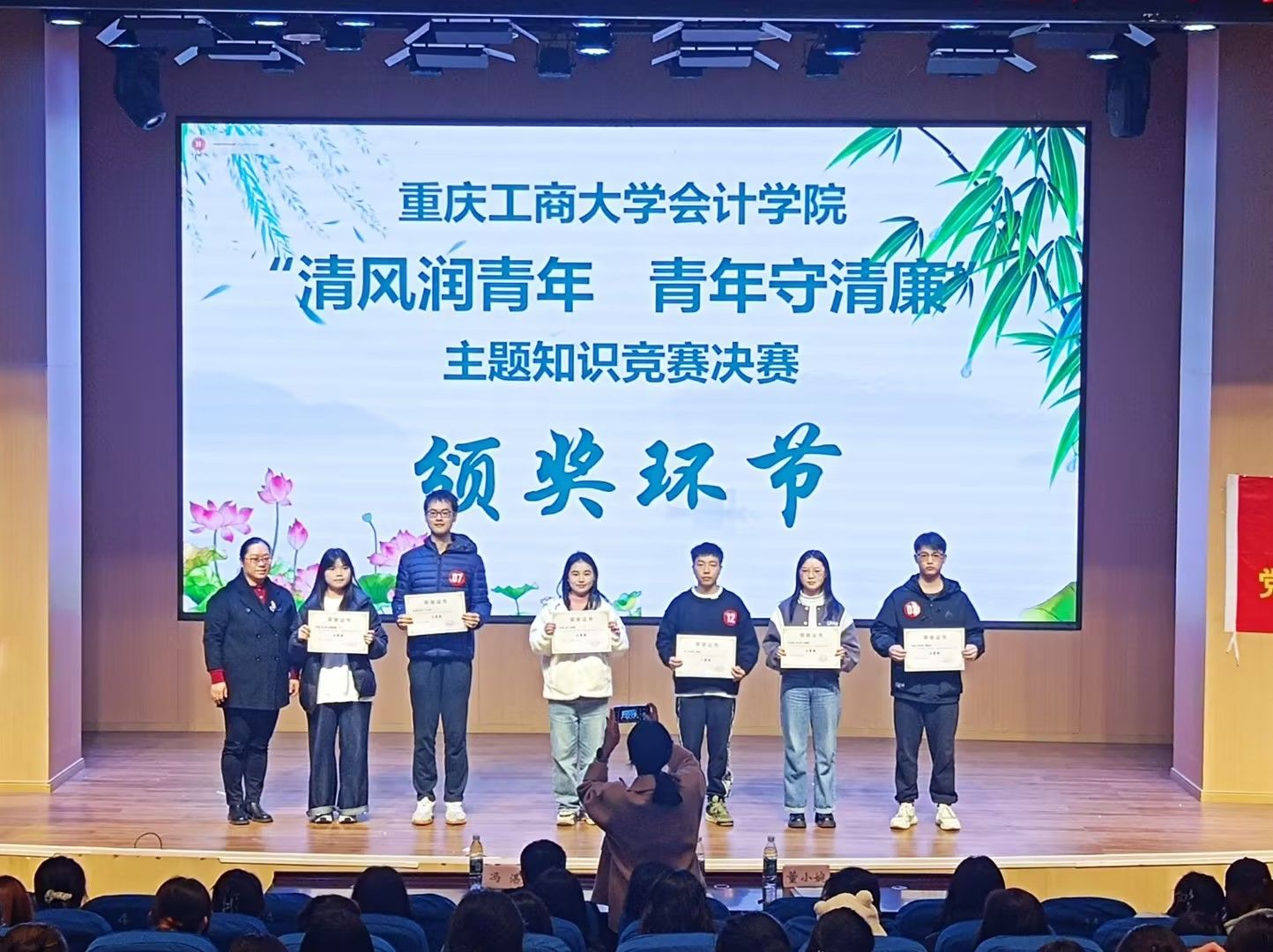 经过激烈的角逐,清逸队斩获一等奖,骏节队、清正队荣获二等奖,却金队、清廉队、墨宏队获得三等奖,付玲霏、黄渝等十名同学获得个人优胜奖。由郝书记为获奖团队颁发荣誉证书并合影留念。