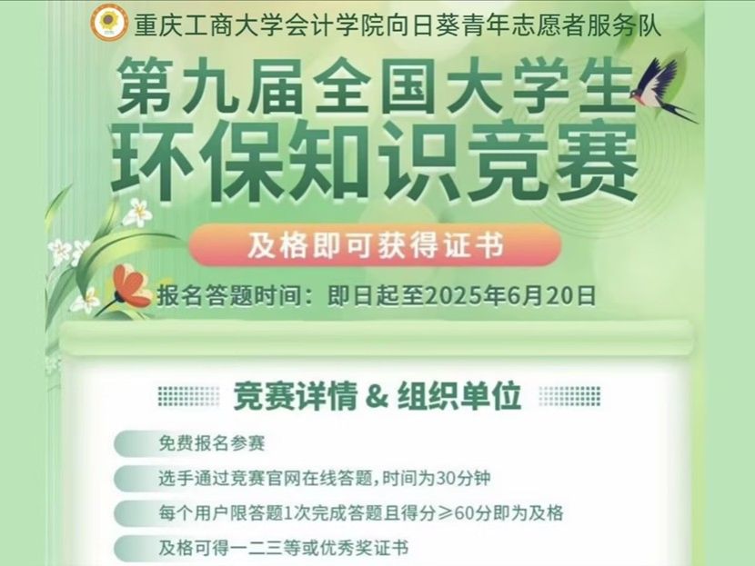 为助力老员工深入学习环保知识,唤醒环保责任意识,营造高校环保文化氛围,k1体育向日葵青年志愿者服务队于2025年4月10日至6月20日在线上顺利开展“绿色征途,‘智’在必得”——第九届老员工环保知识竞赛活动。此次活动积极响应全球生态环境保护的号召,契合我国“绿水青山就是金山银山”的理念,对推动老员工将环保理念转化为实际行动,助力社会环保事业发展具有重要意义。