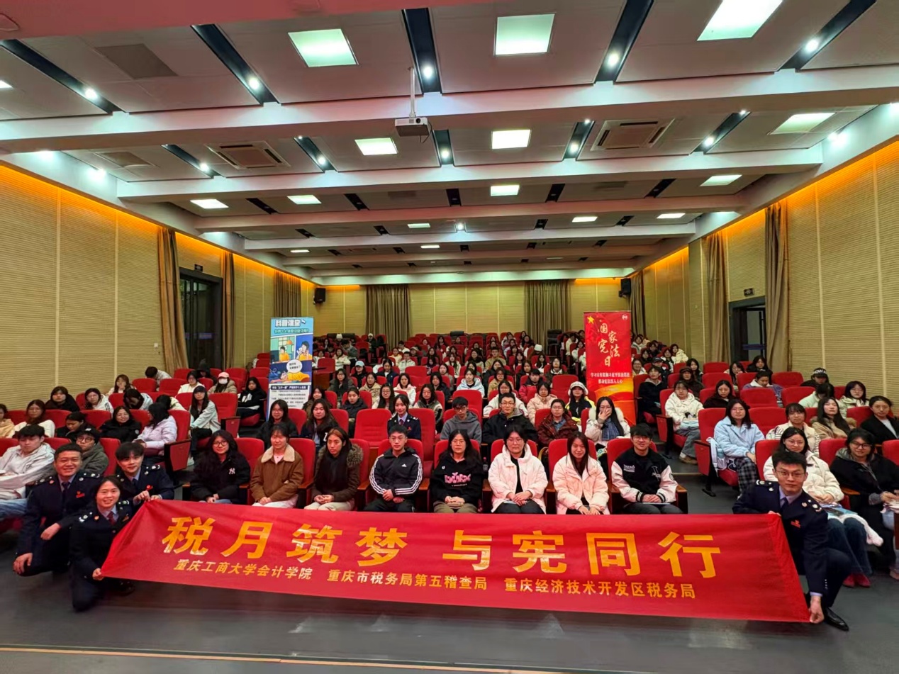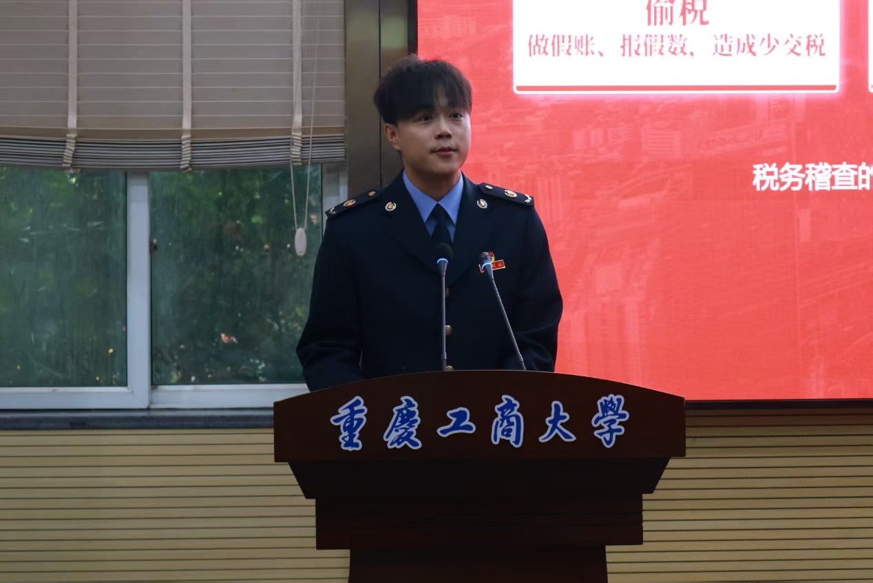 为了增强税收法治意识,向同学们普及税法知识,12月4日下午,“税月筑梦,与宪同行”税收宣传主题讲座于兰花湖报告厅顺利举行。本次活动由k1体育、重庆市税务局第五稽查局、重庆经济技术开发区税务局联合主办,由经开区税务局曹蓝予和第五稽查局姚郅言担任主讲。k1体育2025级200余名员工参加。讲座由k1体育2025级CIMA班杨宏博同学主持。