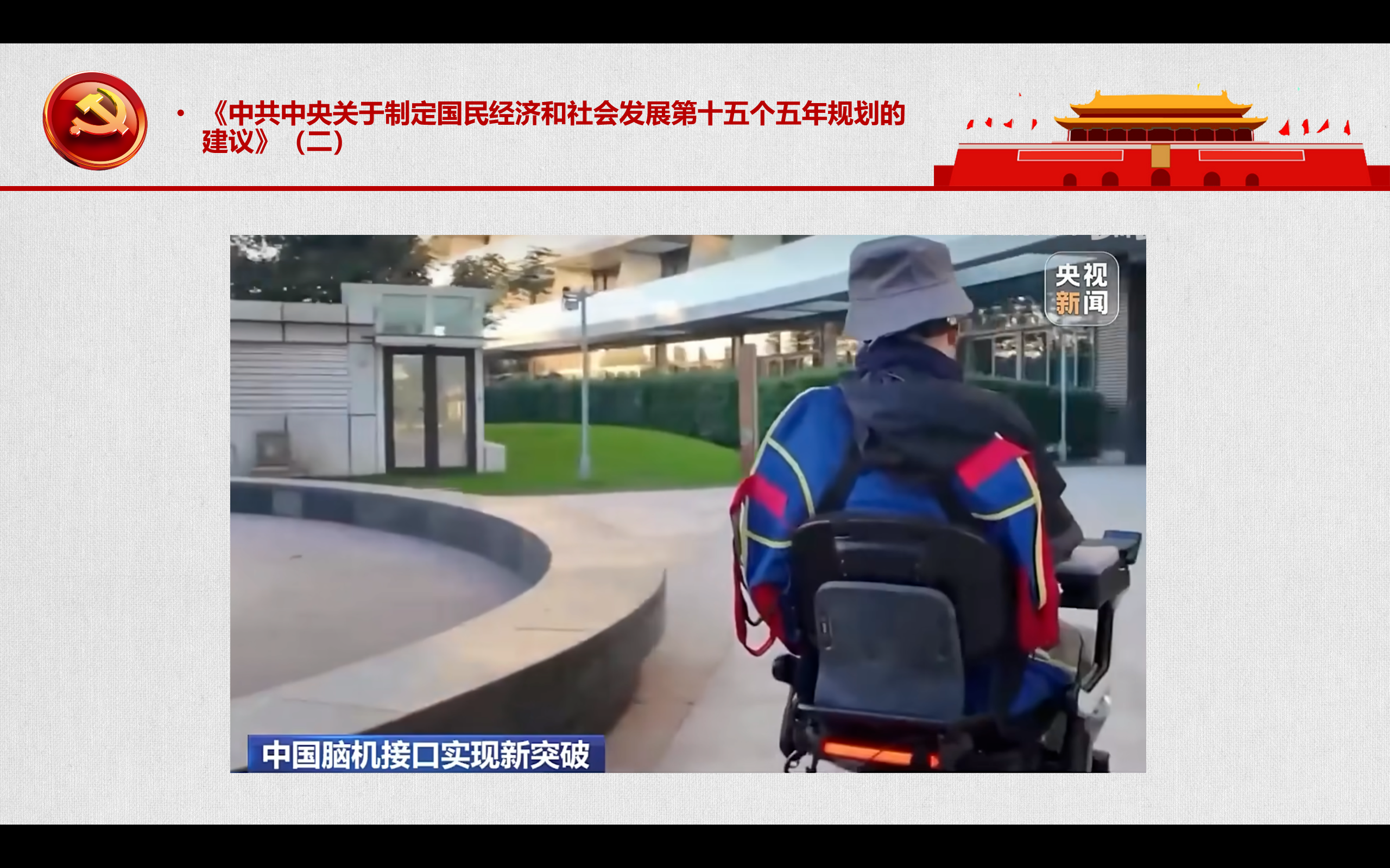 在领学中,蒋弘将宏观政策与鲜活案例相结合,生动阐释了国家战略部署。在谈及培育壮大新兴产业和未来产业时,他以我国近期在侵入式脑机接口领域取得的重大临床突破为例,详细介绍了科研团队如何通过神经数据压缩、混合解码、在线重校准等硬核技术,让重度瘫痪患者实现用“意念”操控外部设备、甚至重返工作岗位的奇迹,展现了前沿科技如何赋能实体经济、创造社会价值。在解读国防与军队现代化建设时,蒋弘以国产“九天”大型无人机首飞成功为案例,剖析了其“大、远、快、高”的卓越性能,及其在快速后勤支援、无人机蜂群母机、远海战略打击等方面的多元军事应用前景,生动说明了科技强军如何筑牢国家安全屏障,先进技术与产业能力如何夯实国防现代化根基。