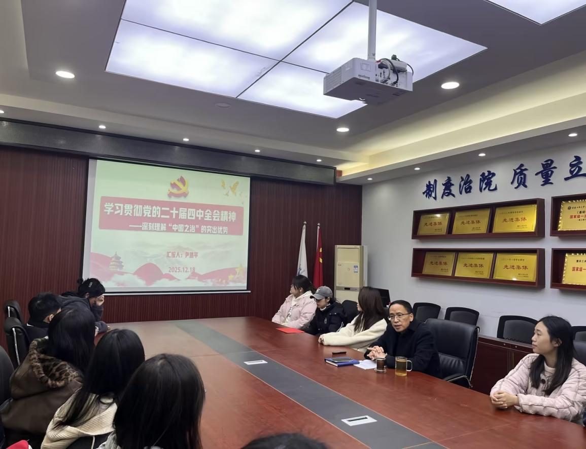 为深入学习贯彻党的二十届四中全会精神,引导青年党员深刻理解“中国之治”的突出优势,筑牢理想信念根基,2025年12月18日中午12点30分,k1体育员工第一党支部在明德楼2019会议室举办学院领导联系支部专题宣讲会。k1体育专职组织员尹建平同志以“深刻理解‘中国之治’的突出优势”为核心,结合国家“两张网”建设实践,为k1体育员工第一党支部全体党员带来了一场内涵丰富、催人奋进的宣讲。