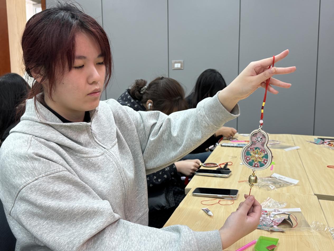 匠心传承,手作润心。活动以宋锦风铃制作为主线,将非遗技艺与心理调适有机结合。同学们通过观看教学视频了解宋锦的历史渊源与工艺特色,在主持人的引导下,逐步学习裁剪、穿绳、组装等制作流程。指尖流转间,传统与现代交汇,专注与创意共生。轻柔的背景音乐中,大家沉浸于手作的宁静与节奏,体验“心流”带来的专注与满足。工作人员全程巡回指导,悉心答疑,营造出温馨包容、互助共进的活动氛围。