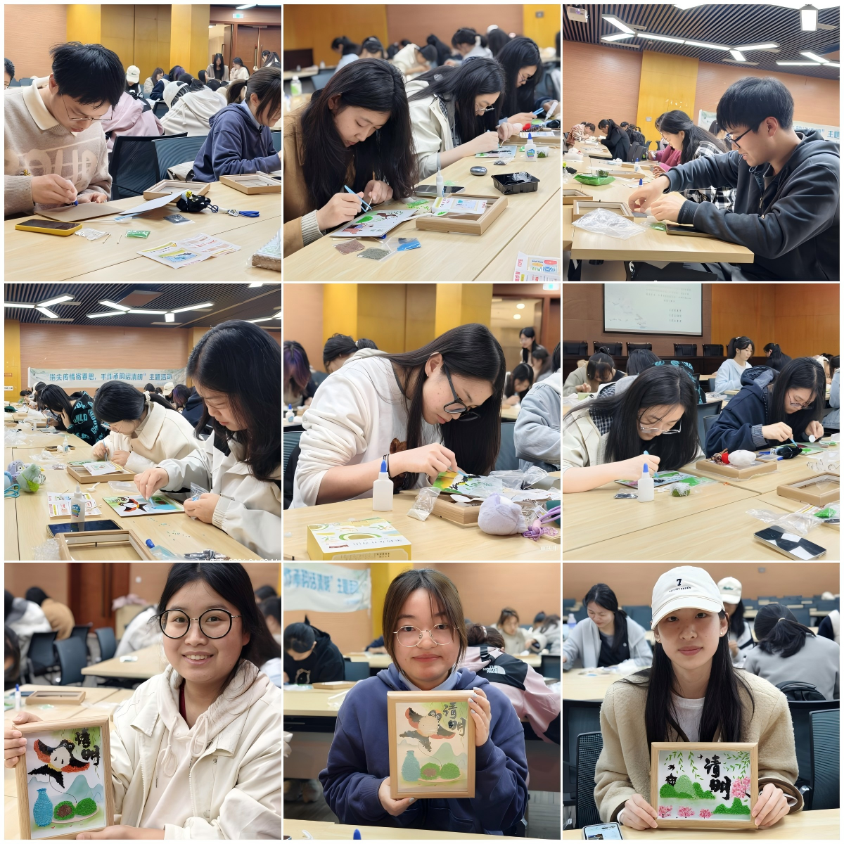三是做清明:指尖匠心创作,五谷画中承春意。最后便是豆子粘画环节,工作人员先是示范教学,细致讲解制作步骤与工具使用要点。随后,同学们以五谷杂粮为材料,围绕清明主题展开自主创作,在同学们的指尖巧妙组合下,一粒粒五彩豆米化作一幅幅寓意“春和景明”“五谷丰登”的精美画作。活动尾声,同学们纷纷将作品集中展示,表达对春天、对传统、对生活的美好祝愿。