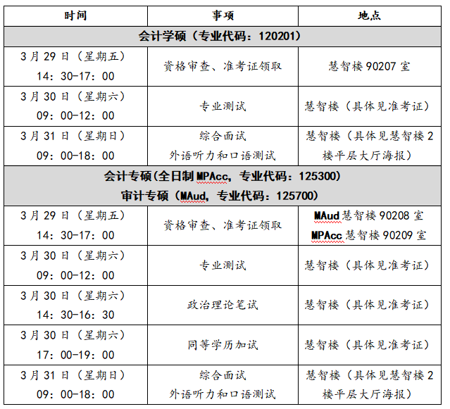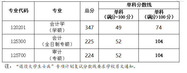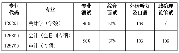 2.会计硕士(全日制专硕)、审计硕士(专硕):入学考试总成绩实行百分制,按照初试成绩占50%、复试成绩占50%的权重计算。