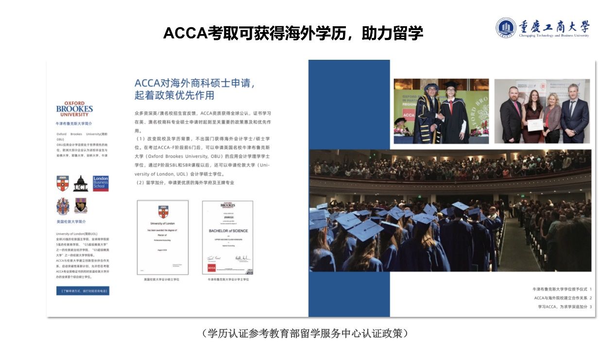 ACCA在英国被视为同等硕士学位的资格证书,备受海外名校认可。ACCA是第一个提供硕士学位的专业财会组织,不出国门就可获得伦敦大学(UOL)的硕士学位。并在ACCA的F阶段即可申请牛津布鲁克斯大学(OBU)的应用会计学士学位。