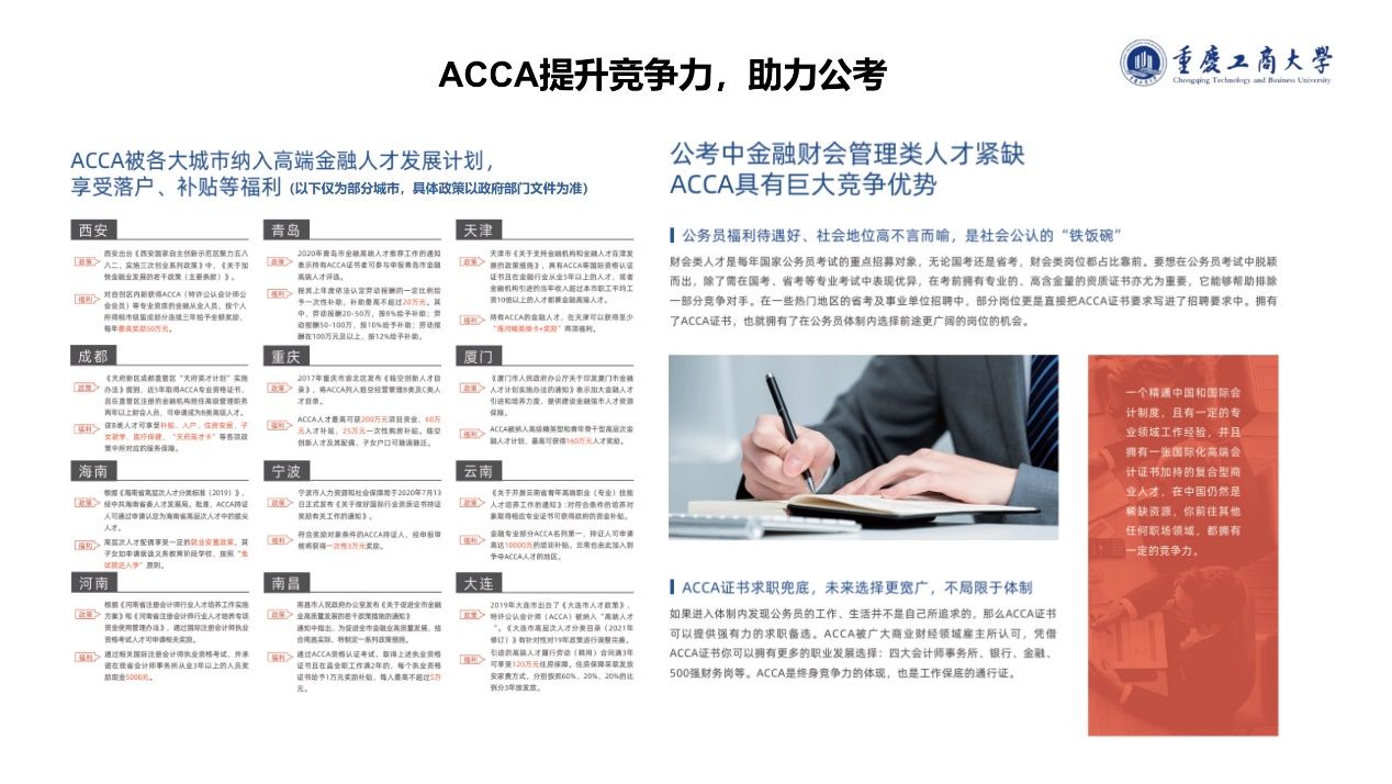 公务员选拔考试中部分岗位更是直接把ACCA证书要求写进了招聘要求中。拥有了ACCA证书,也就拥有了在公务员体制内选择前途更广阔的岗位的机会。
