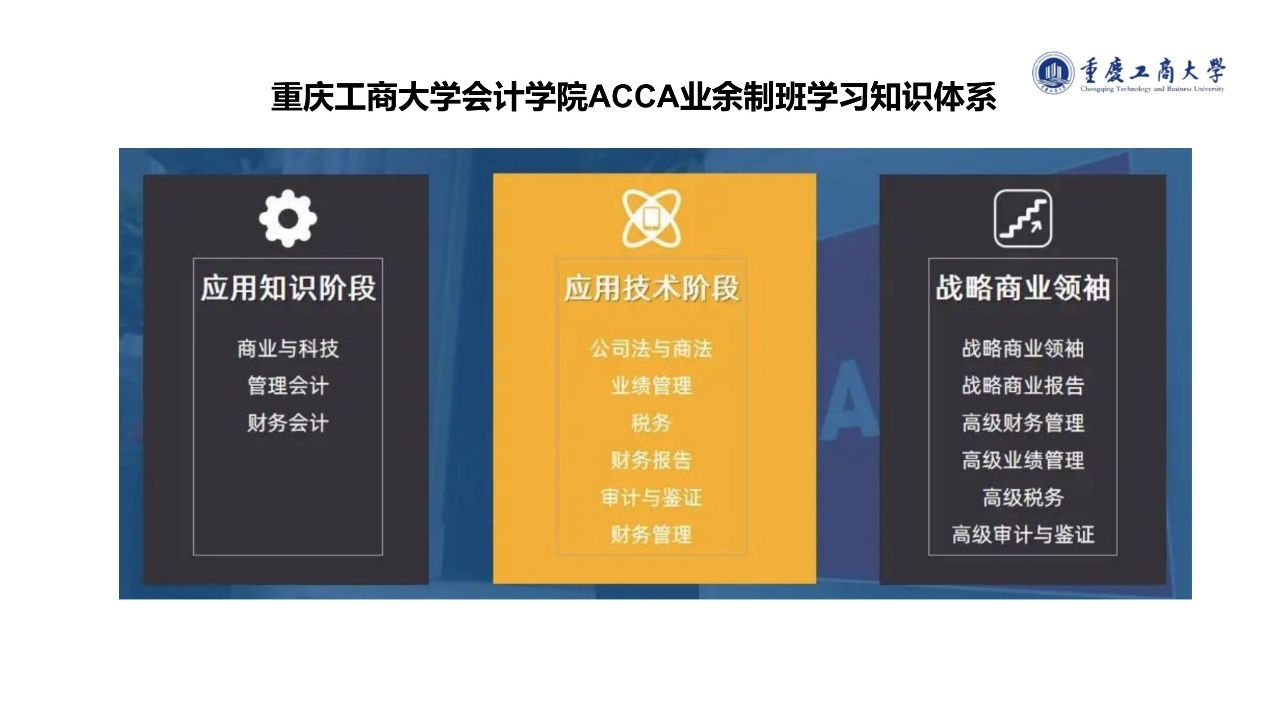 ACCA业余制班课程注重培养员工的专业能力、分析能力、判断决策能力等。帮助员工由浅及深地学习全球前沿的“商、法、管、财”等专业知识,课程从应用知识阶段到应用技能阶段,再到战略商业领袖阶段,理论与实践相结合。