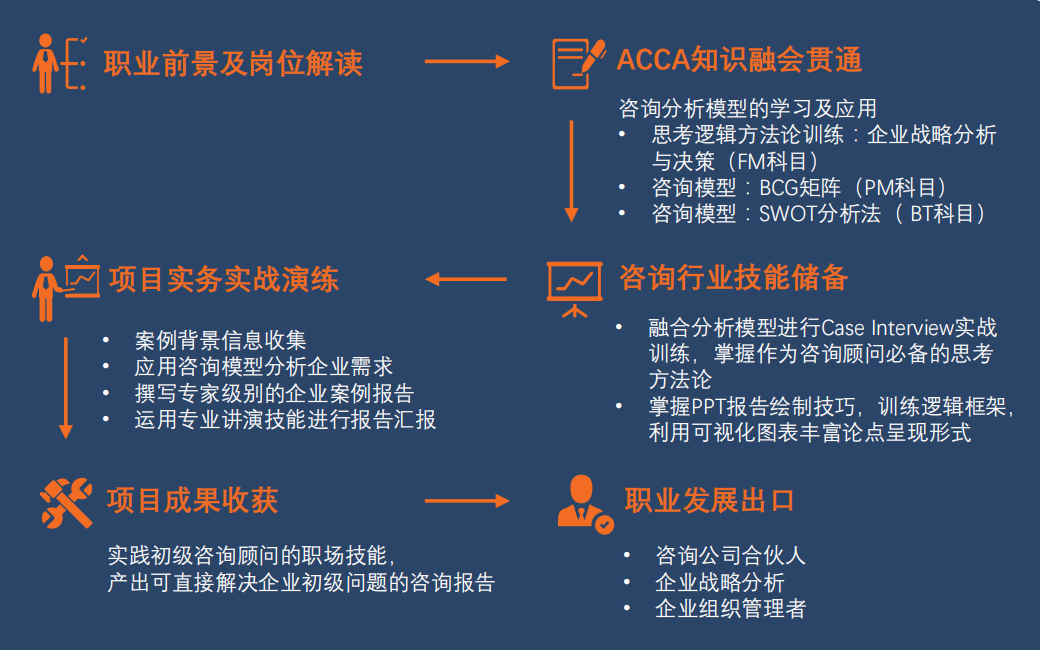 ACCA业余制班结合职业发展大数据的分析,精选发展快,薪酬好,专业度高的四大职业赛道:商业分析师\数字化转型顾问\审计与鉴证师\名企管培生。以PBL(Project-Based Learning)项目制教学法,沉浸式体验岗位的职责与职能,帮助员工提前掌握未来职场的核心技能,产出实训作品集。