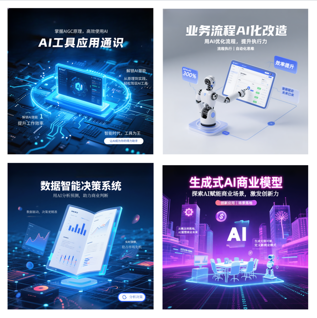 为适应数字化转型浪潮,班级配置:AI工具应用通识、业务流程AI化改造、数据智能决策系统、生成式AI商业模拟课程。课程包含技术学习、实操项目2个模块。