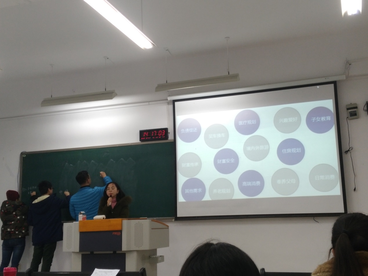 随后,邓阳老师请来3位同学将课件中的目标分成3个阶层,她通过分析与讲解,将投资目标大致分为三个阶段:第一阶段 财富创造;第二阶段 财富安全;第三阶段 财富传承。其中,邓阳老师主要围绕“奉养父母”与“医疗规划”展开了讨论,强调了在如今的社会经济情况下,应该以适宜的社会状况来合理制定自己的投资规划。