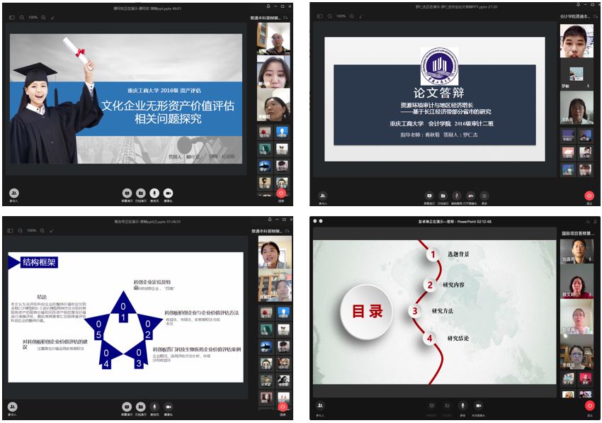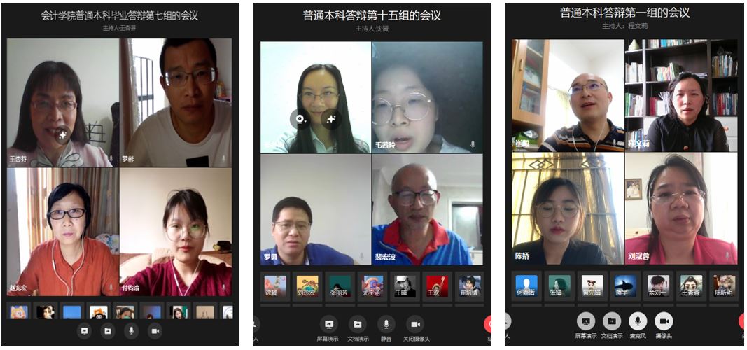 论文答辩过程中,老师们和同学们并未因为疫情而松懈,以饱满的热情和严谨的态度投入到论文答辩中。许多同学准备充分,身着正装,制作精美的PPT,展现了会计学子良好的精神风貌和专业素养。“生活需要仪式感,答辩也需要仪式感。这不仅是同学们对答辩的重视,也是对答辩老师的尊重”,杜迎新老师如此感慨到。答辩期间,各个答辩小组都分享了答辩现场的链接,孙芳城董事长、宋豫副董事长、罗惠玉书记、曾晓松副处长、杜朝辉副主任等领导,学校与学院督导刘淑蓉、李光凤、崔飚等老师,都随机进入各答辩小组进行检查,并给予了较高评价。评估办杜朝辉副主任曾到多个小组的答辩现场旁听,她评价说,“整个论文答辩组织非常到位,答辩现场氛围好,答辩老师敬业;提出的问题专业性强、有深度;同学们准备充分,表现比较自信,语言表达能力强”。