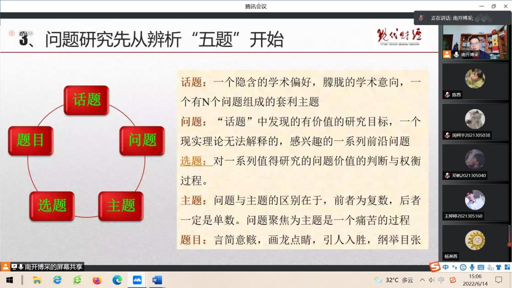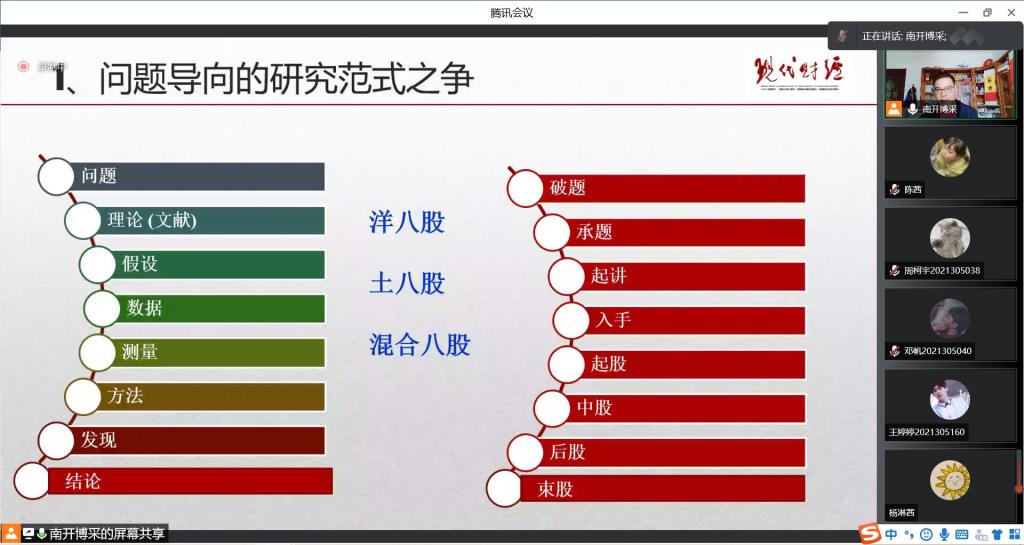 随后蔡教授提到在研究问题时首先要思考一些问题:这个问题有人研究吗?这是新问题还是旧问题?问题范围是否宏大?自己是否有能力驾驭?能不能找到证据支撑?在研究范式中,例如“洋八股”“土八股”“混合八股”都有各自的缺陷,在实际研究中我们可以从五题入手,即话题、问题、选题、主题、题目。另外蔡教授特别提出问题研究要结合中国国情,不能用西方的“苹果”来解释中国的“橘子”。