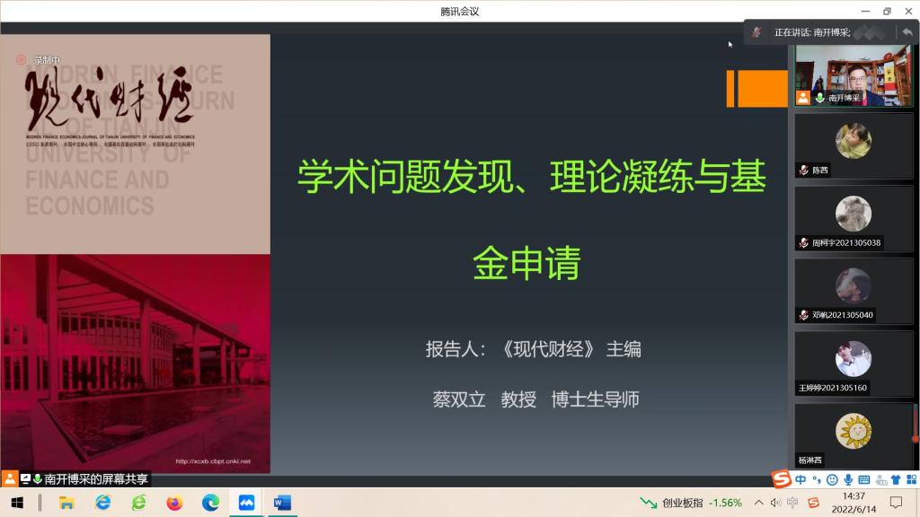 2022年6月14日,k1体育第二期会计/审计学术大讲堂以线上会议的形式顺利举行。来自天津财经大学的《现代财经》期刊主编蔡双立教授为我们带来了题为《学术问题发现、理论凝练与基金申请》的讲座。本次讲座由k1体育副经理钟廷勇主持,k1体育部分研究生参与了本次讲座。