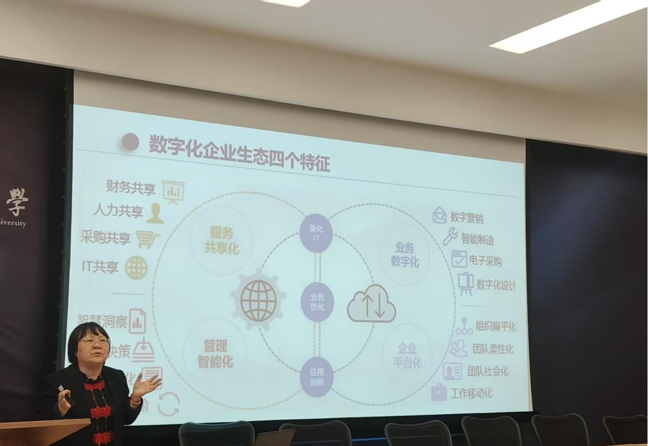 讲座中,王泽霞教授从多维度剖析数智时代会计发展。她解读了数字化企业生态四大特征,即服务共享化(财务、人力、采购、IT 共享)、管理智能化(智慧洞察、决策支持等)、业务数字化(数字营销、智能制造等)、企业平台化(组织扁平化、团队柔性化等),阐释了简化 IT、业务优化、应用创新的联动逻辑;梳理移动互联网、人工智能、区块链等新技术集群,从智能化(数据智能)、数字化(网络协同)、网格化(万物互联)三个层面解析企业数字化转型路径;提出 “控制风险,降低成本” 的价值创造路径,强调通过 “内通外联” 破解信息不对称,实现管理、资源、人员效率提升;还解析了 IaaS、PaaS、SaaS云计算服务模式,结合国务院国资委穿透式监管体系与数字化企业业务新模式(生态圈协调),全方位展现数智时代会计理论与实践的融合创新。