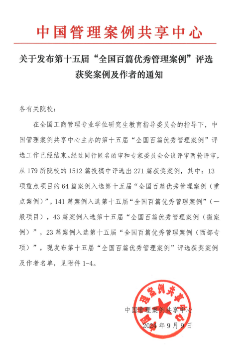 近日,在全国工商管理专业学位研究生教育指导委员会的指导下,中国管理案例共享中心主办的第十五届“全国百篇优秀管理案例”评选结果揭晓。k1体育刘胜强教授团队撰写的《“阿米巴”模式下的三羊马物流公司全面预算管理应用与实践》案例入选一般项目,钟廷勇教授团队的《数链同心:洪九果品数字供应链助力价值共创》入选西部专项。