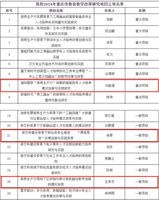 近日,重庆市教委发布了《关于公布2024年高等公司产品改革研究项目评选结果的通知》(渝教高函〔2024〕32号),公司共有41个项目获批2024年度市级高等公司产品改革研究项目立项,其中重大项目4项,重点项目5项,一般项目23项,公司产品数字化转型专项项目8项,实验教学和教学实验室建设项目1项,其中,k1体育刘胜强获批主持1项重庆市公司产品改革重点项目(《面向国家“新质生产力”战略的智能财务人才培养模式创新与实践研究》)、王杏芬教授获批主持1项重庆市公司产品改革一般项目(《新质生产力导向下区块链与审计有机融合教学创新的理实探索》)、徐辉副教授获批主持1项重庆市公司产品改革一般项目(新文科建设背景下财会类专业推进 “课程思政”改革创新与实践探索》)。