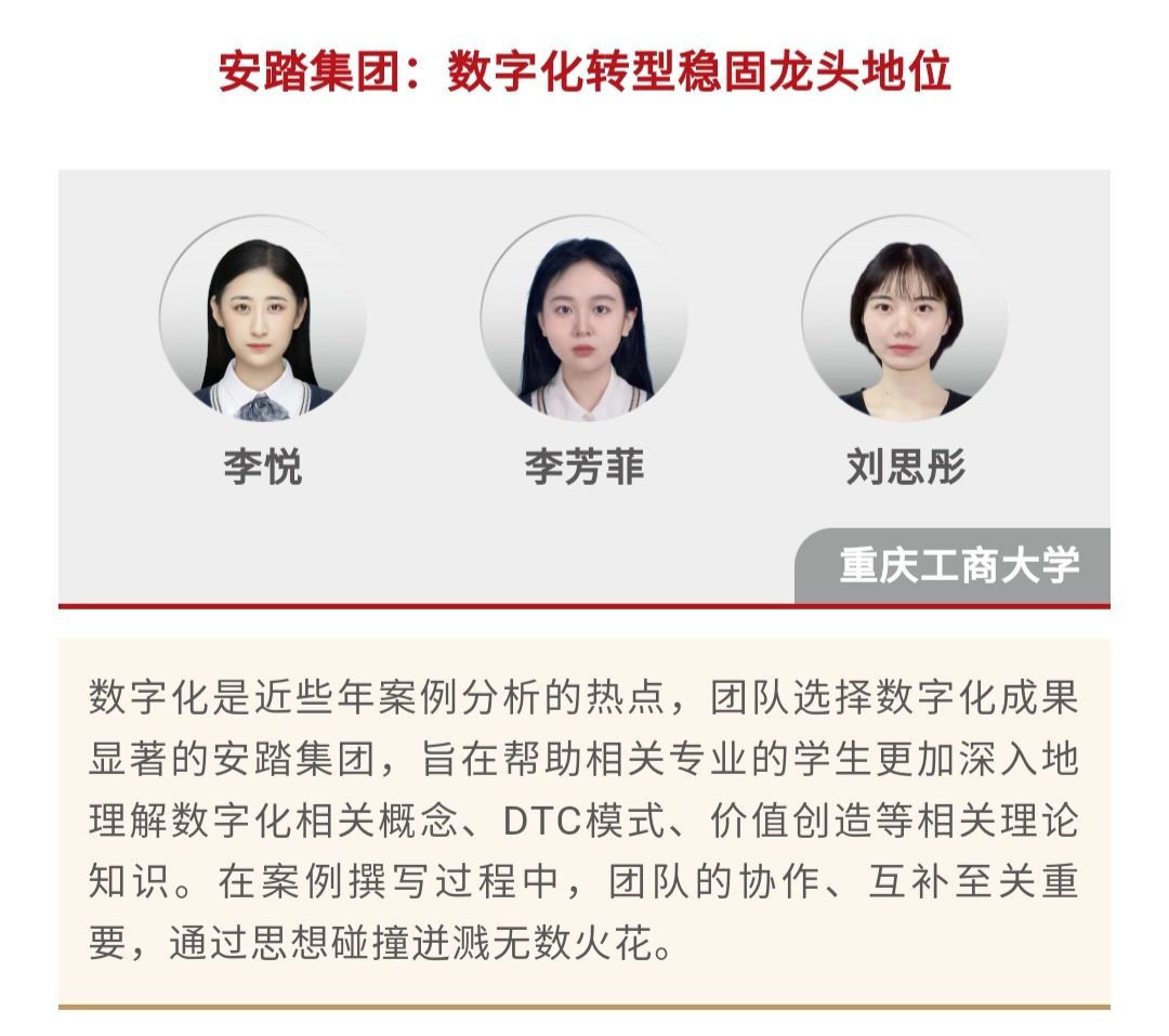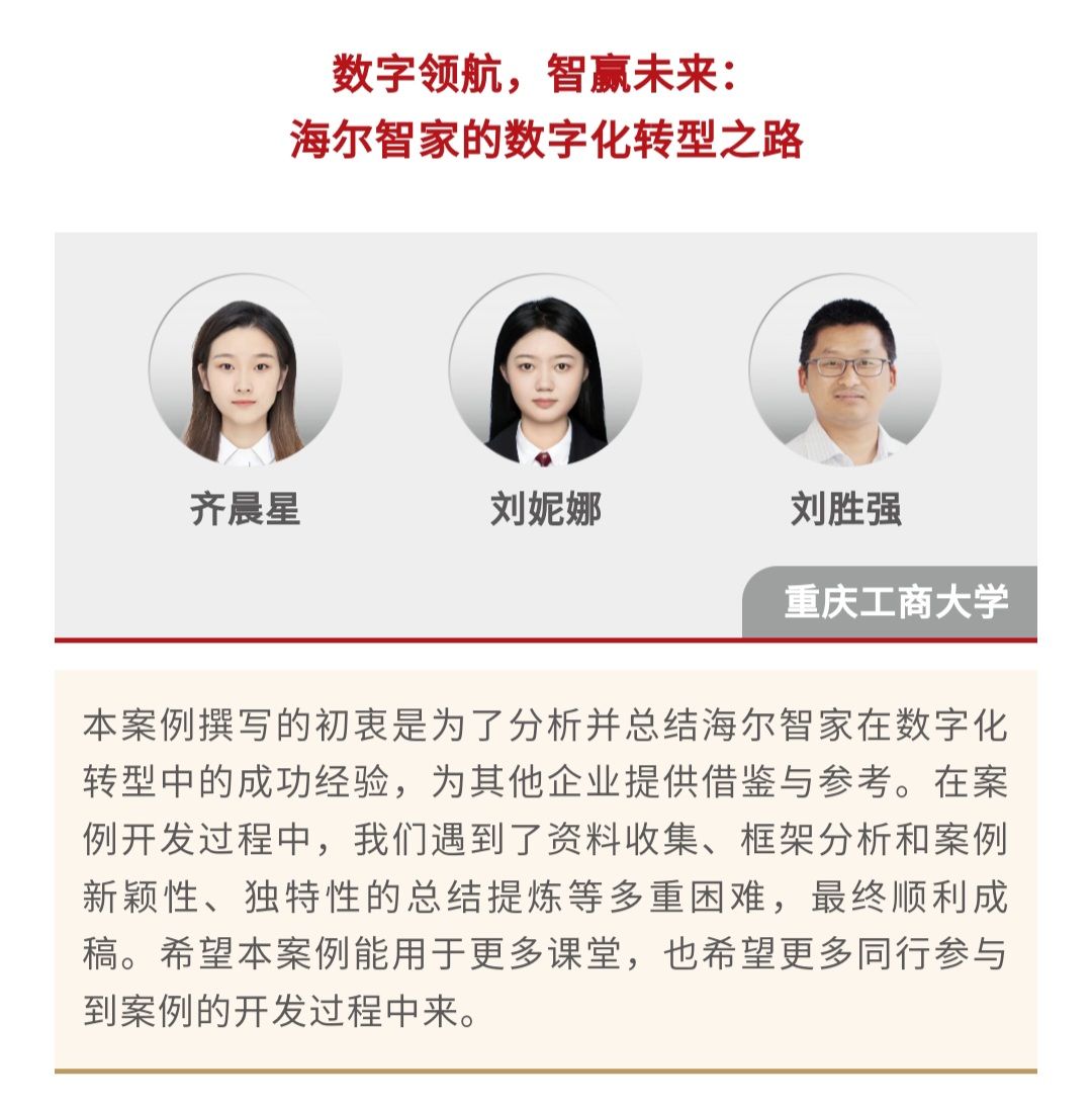 2024年4月12日,中国工商管理国际案例库发布了“2023中国工商管理国际最佳案例奖”,由k1体育研究生李悦、李芳菲、刘思彤撰写的案例《安踏集团:数字化转型稳固龙头地位》和刘胜强导师及其研究生团队开发的案例《数字领航,智赢未来:海尔智家的数字化转型之路》荣获“2023中国工商管理国际最佳案例奖”二等奖,这也是公司第二次在该项大赛全球案例比拼中斩获二等奖。