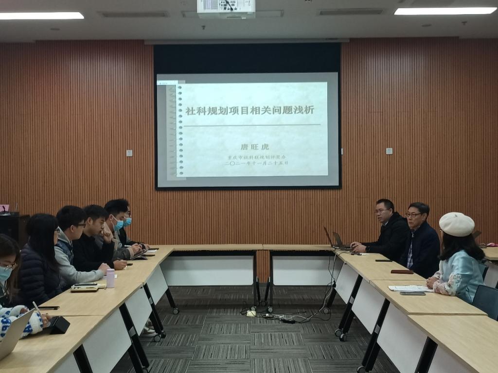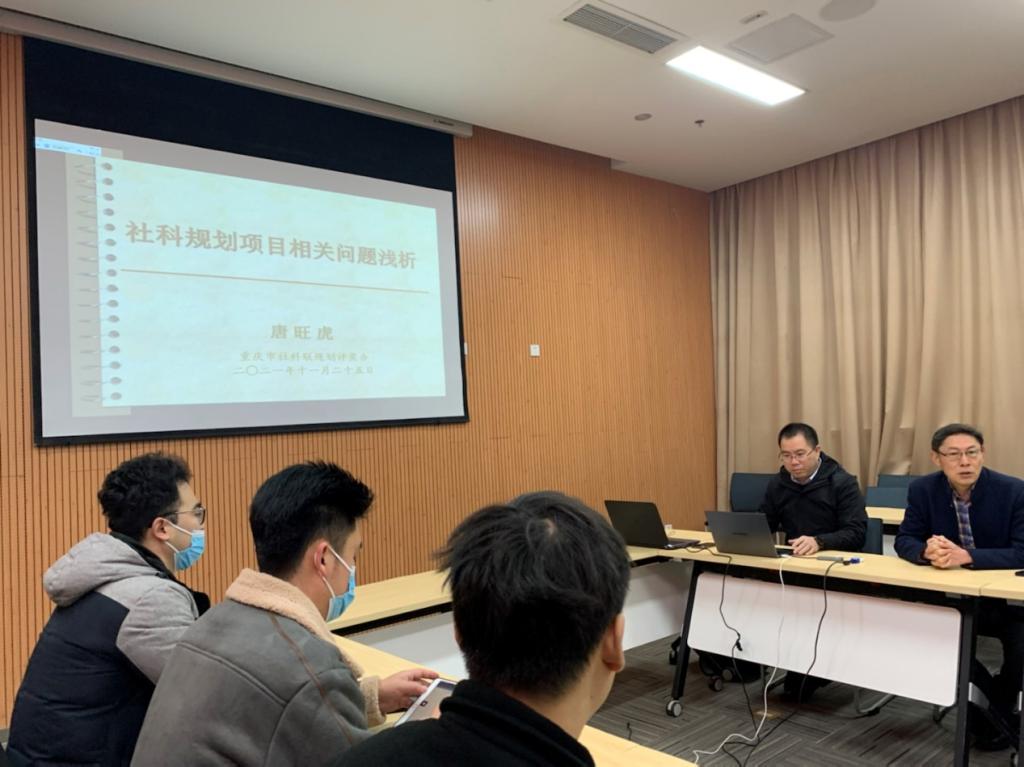 唐主任以国家社科规划项目相关问题浅析为题,从重庆市国家社科基金近年立项情况开始,分析了国家社科基金申报过程中普遍存在的问题,从国家社科基金选题价值、题目表述、选题依据以及写作技巧等入手,介绍了国家社科基金申报书填报过程中的注意事项。提醒老师注意申报合适的项目类型,凝练学术问题,规范论证过程。唐主任同时介绍了市社科项目的基本情况,鼓励大家积极申报科研项目,早准备,多打磨。最后,唐主任对老师们的申报书、申报选题进行了一对一的指导。