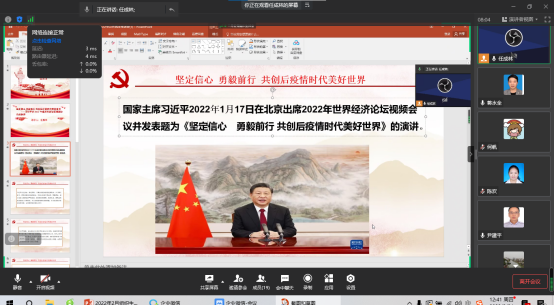 随后,任成林同志领学了习近平在北京出席2022年世界经济论坛视频会议并发表题为《坚定信心勇毅前行共创后疫情时代美好世界》的演讲。当今世界正在经历百年未有之大变局。这场变局不限于一时一事、一国一域,而是深刻而宏阔的时代之变,我们要坚定信心、同舟共济,避免任何相互掣肘、无端甩锅;要摒弃冷战思维、携手合作,聚力战胜疫情;要跨越发展鸿沟,重振全球发展事业,全力扫除新冠肺炎疫情阴霾,全力促进经济社会恢复发展,让希望的阳光照亮人类!此次会议中,任成林同志从携手合作、聚力战胜疫情; 化解各类风险、促进世界经济稳定复苏两个方面详细解读了习总书记提出的“凝聚国际共识,增强政策协同,防范系统性风险。”这一重要思想。