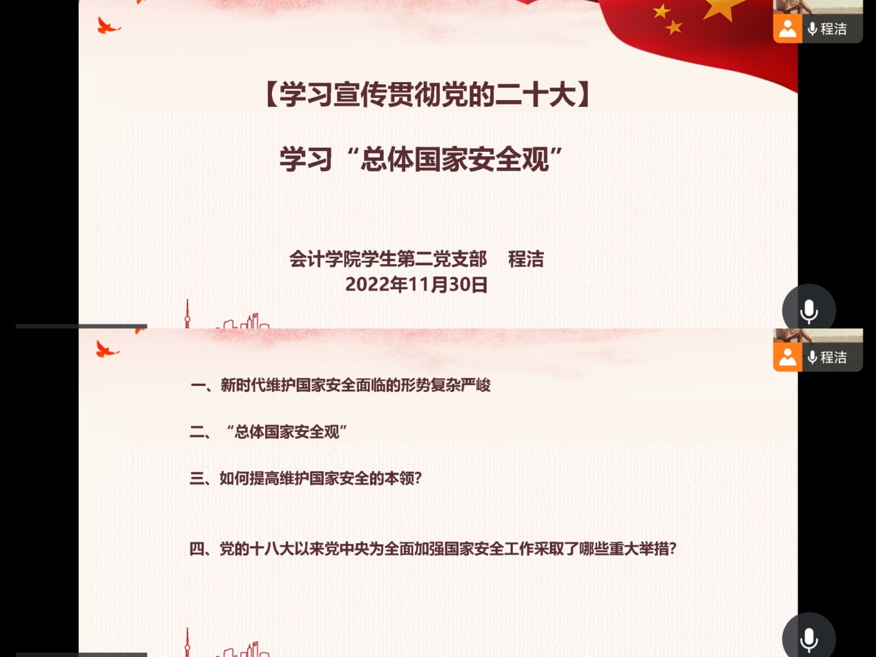11月30日,程洁带领全体党员学习了“总体国家安全观”,分析了新时代维护国家安全面临的严峻形势;讲解了“总体国家安全观”的提出与涵义;讨论了如何提高维护国家安全的本领。12月26日,学习了“党的十八大以来党中央为全面加强国家安全工作采取的重要举措”,包括党的十八大以来加强党对国家安全工作的绝对领导所采取的措施,如何健全完善国家安全体系,如何坚定维护重点领域国家安全,如何着力防范化解重大风险。两次党课均密切结合国内国际时事,注重引导启发,支部党员认真思考,积极参与,踊跃发言。