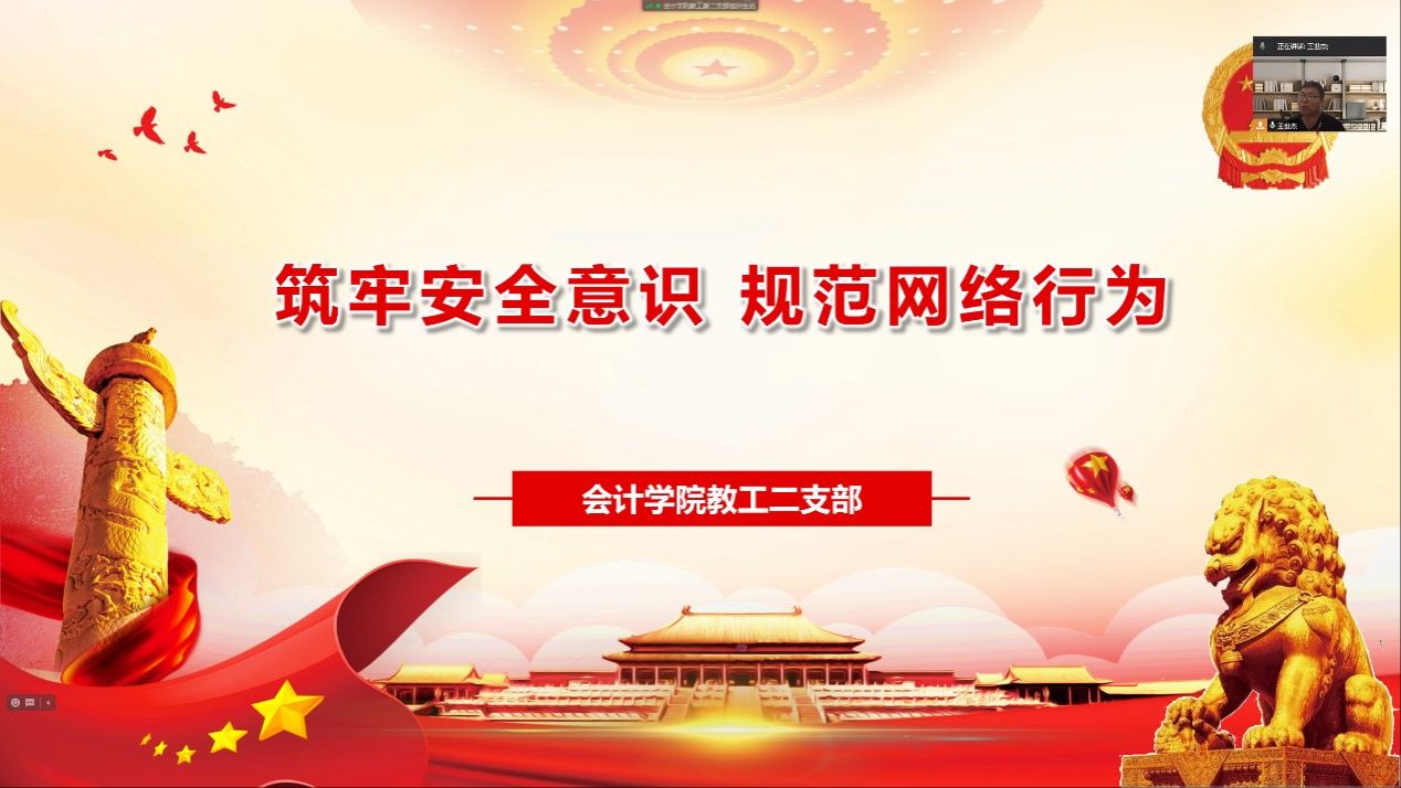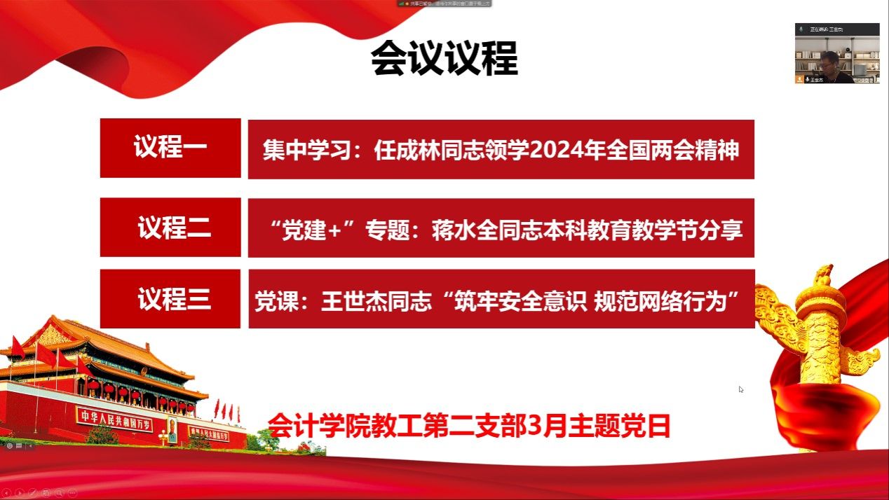 主题党课阶段,王世杰做了《筑牢安全意识 规范网络行为》的主题党课,从总体国家安全观出发,结合两会关于网络安全的相关论述,分析了当前我国网络安全发展新趋势,全面解读了《中国共产党党员网络行为规定》,提出支部党员应该将总体国家安全观自觉融入日常工作生活中中,在网络上要严守国家密码和工作秘密,规范好网络行为。