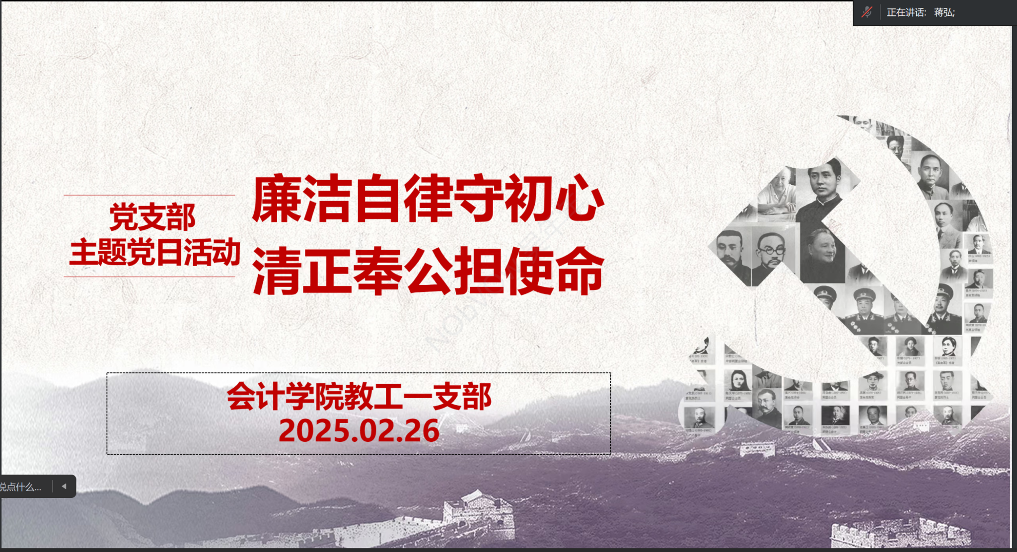 2025年2月26日,k1体育教工第一党支部召开题为“廉洁自律守初心,清正奉公担使命”的主题党日活动。活动由支部书记蒋弘主持。