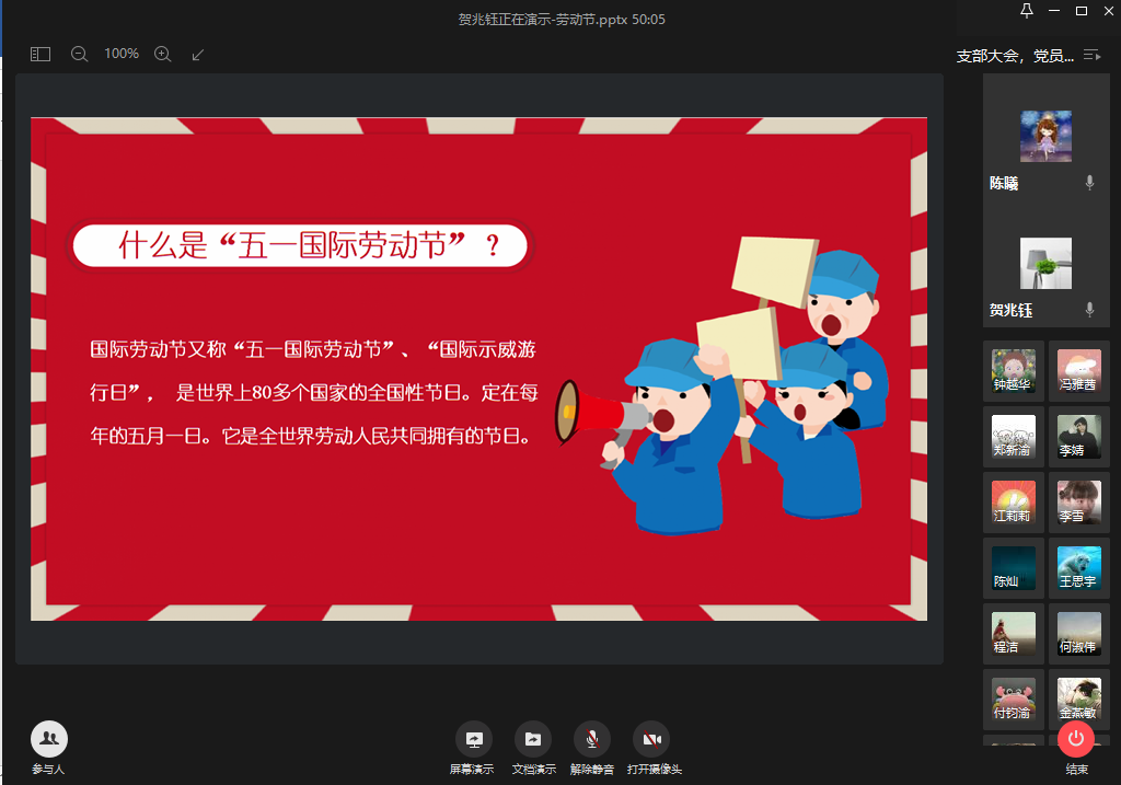 2020年5月1日11:00,员工第三党支部在线开展了主题为“劳动教育”的党日活动,支部书记陈曦老师,程洁老师以及三支部全体员工党员参加了此次活动。