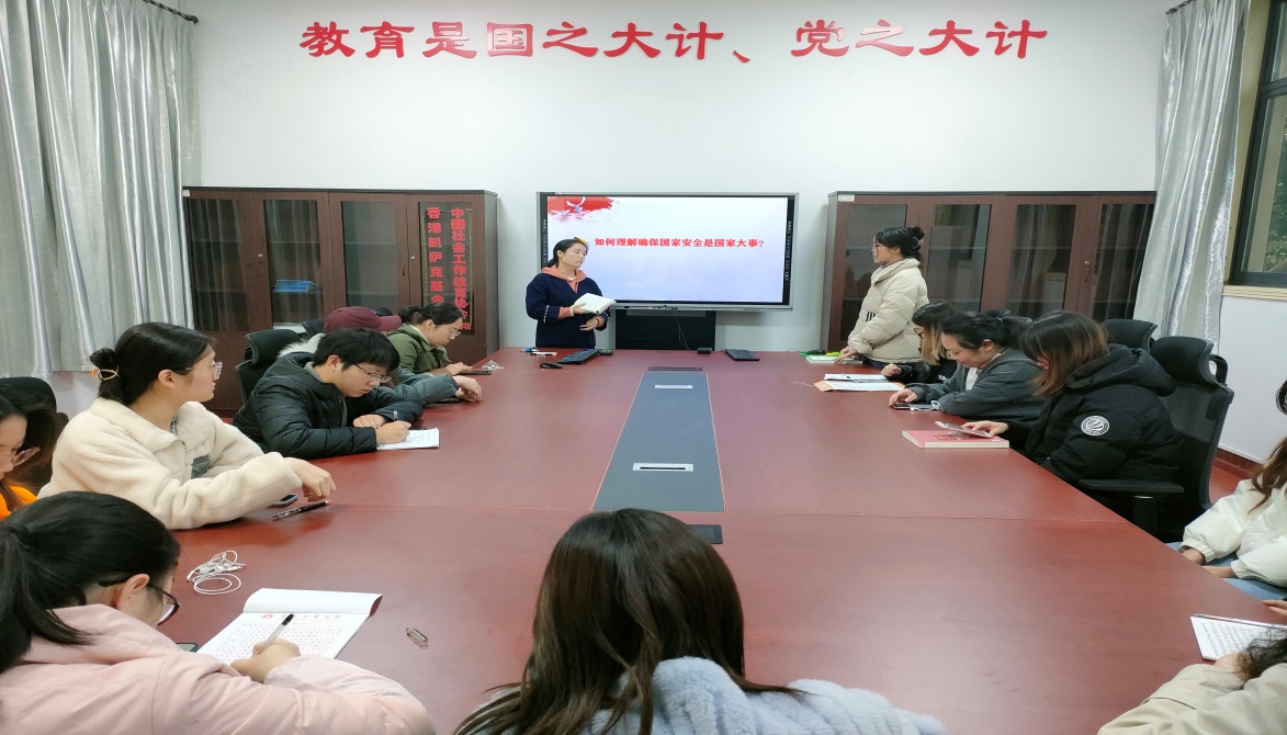 接着,程洁老师以“如何理解确保国家安全是国家大事”为题介绍了国家安全的重要性并带领大家进一步学习总体国家安全观,她谈到:国家安全没有局外人,没有旁观者,更容不得半点迟疑,半步妥协。维护国家安全,就是在保护我们自己的切身利益。从小事开始,让维护国家安全成为每个人的自觉,成为一种意识、一种责任。作为员工党员,应率先深刻领会和全面把握总体国家安全观的丰富内涵,牢固树立国家安全意识,用理论武装自己的头脑,确保行动方向正确,以自己的一言一行带动身边群众提高国家安全意识。