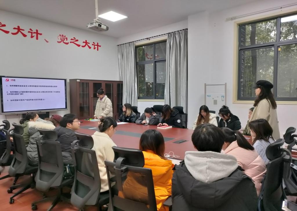 会议伊始,支部书记陈曦老师对开展“十九届六中全会”专题学习的意义做了强调,领学了《中国共产党第十九届中央委员会第六次全体会议公报》及《中共中央关于党的百年奋斗重大成就和历史经验的决议》。陈曦老师还带领同学们在领学、自学的基础上围绕:如何理解党在社会主义革命和建设中取得的独创性理论成果?如何理解认识新时期中国特色社会主义理论体系实现了马克思主义中国化新的飞跃?如何理解中国共产党百年奋斗的历史意义?几个问题开展了研讨,邀请每位与会党员同学谈谈自己对这些问题的想法和认识。