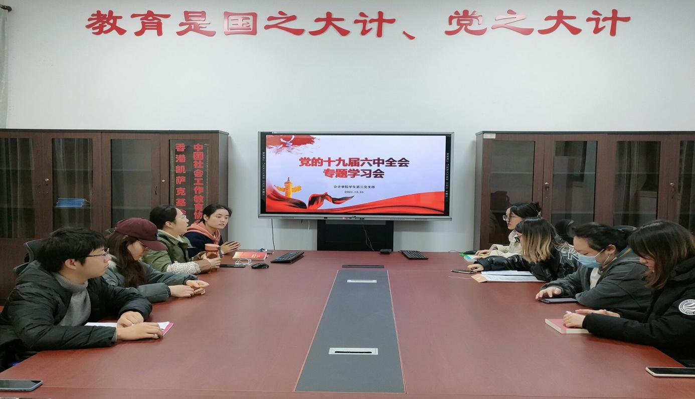 党的十九届六中全会内涵丰富,意义重大。为坚持全面系统学习,把党的十九届六中全会精神与党史学习教育相结合,准确把握重要思想、重要论断、重大举措,努力学懂弄通悟透,抓好贯彻落实。2021年12月16日下午,k1体育员工第三党支部于明德楼1015教室开展“十九届六中全会”专题学习会,会议由张雪凝同学主持,支部全体党员参会。