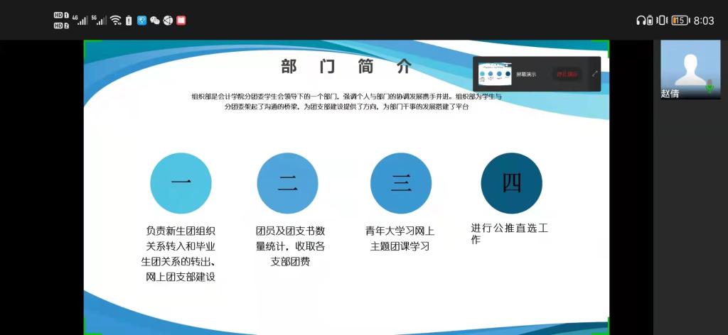 会议伊始,分团委组织部赵倩从职责认知、工作回顾、下半年安排、展望总结四个方面作了工作汇报。她表示,上半期工作,部门内部相处融洽,但还应加强团建,提高部门工作效率。下半期,希望在完成自己的本职工作的同时,组织部也能协作其他部门举办更多活动。
